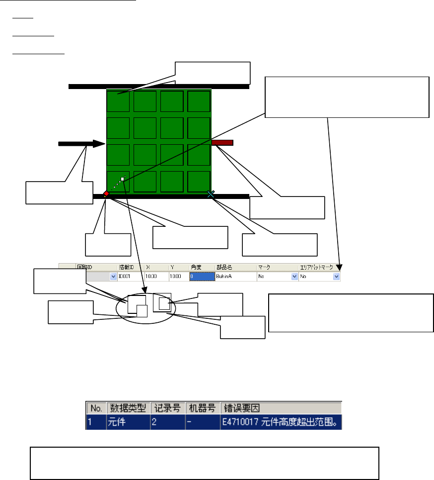 JaNets 使用说明书 7 编辑程序 7-84 关于查看器显示区域的选项卡 向导:显示当前选择项目的相关说明 检查结果:显示数据一致性检查结果 基板查看器:用图形方式确认基板传送方向、基板分布偏移量、定位孔位置、元件配置等。 双击相应元件,选择显示相应的贴片数据。 图 7-5-1-2 基板查看器上的名称说明 元件 D 电路配置 双击显示的元件,会显示相应的贴片 数据 基板传送方向 基板基准位置 孔位置 元件 B 元件 C 停止挡销 设…