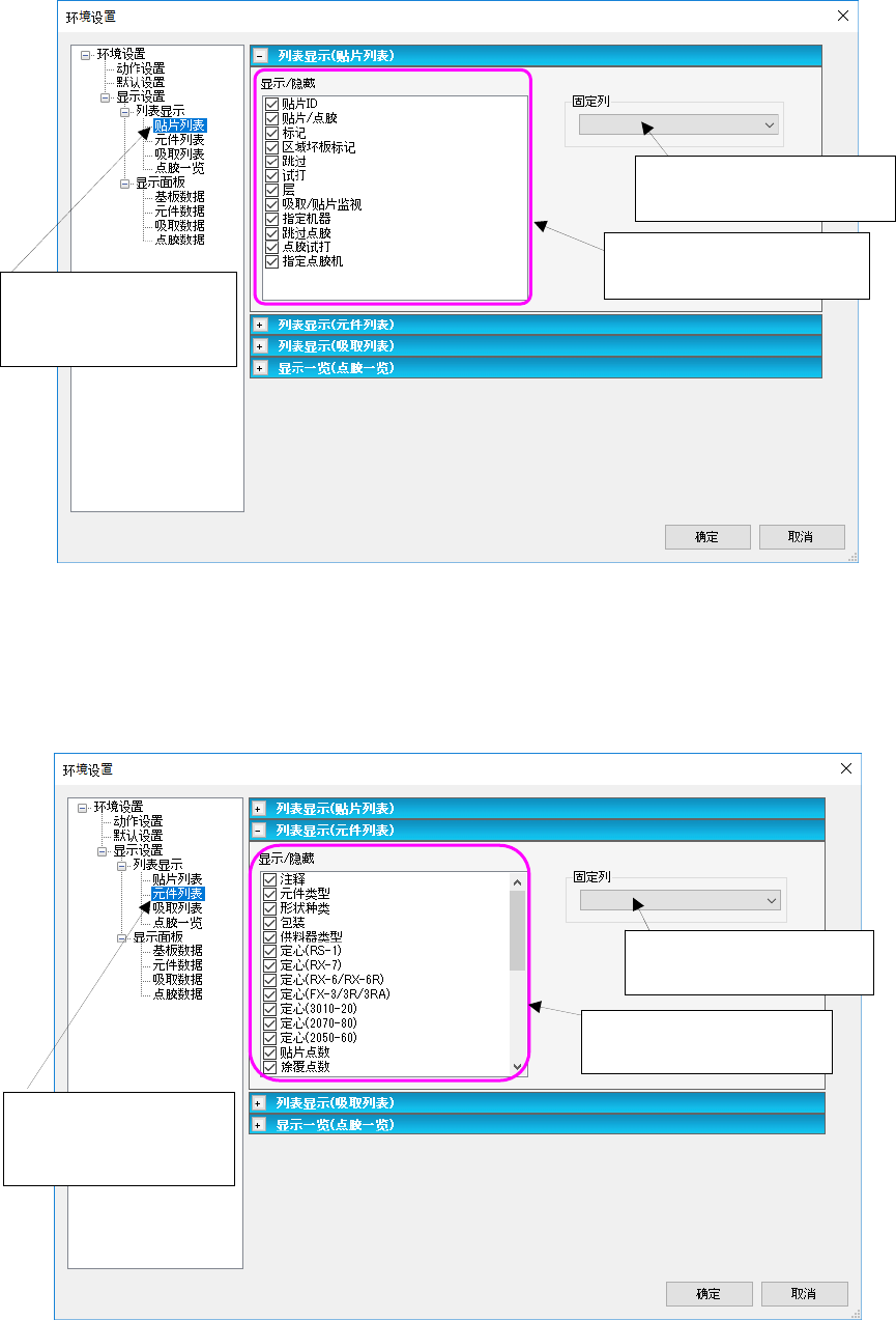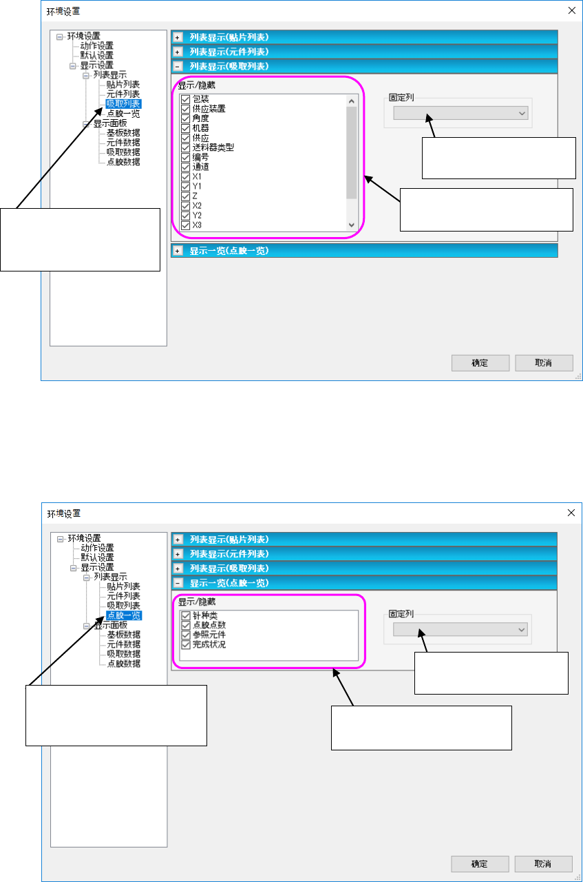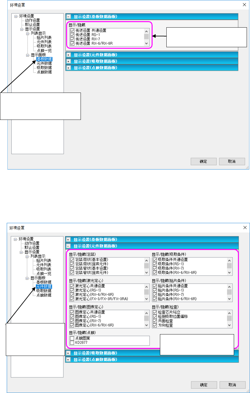 JaNets 使用说明书 7 编辑程序 7- 11 5 ( 5) 列表显示 ( 吸取列表 ) 设置吸取列表画面项目的显示 / 隐藏。 图 7-6-6-7 环境设置 ( 吸取列表 ) 画面 ( 6) 显示清单(粘接清单) 设置粘接清单画面项目的显示 / 不显示画面。 图 7-6-6-8 显示设置 ( 基板数据面板 ) 画面 对列表画面滚动时的固 定项目编号进行设置。 勾选的项目会在吸取数据列 表画面中显示。 勾选的项目会在粘接数据列 表画…