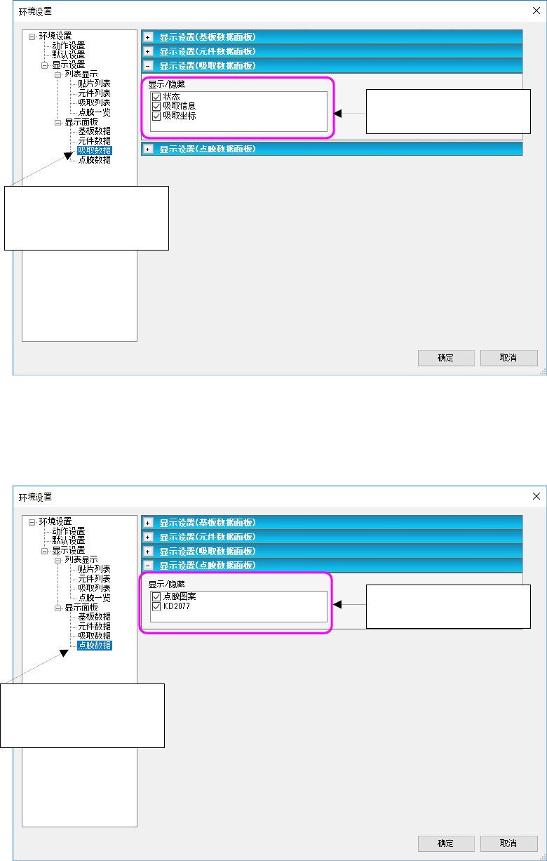 JaNets 使用说明书 7 编辑程序 7-1 17 (9)显示设置 ( 吸取数据面板 ) 设置吸取数据面板的显示 / 隐藏。 图 7-6-6-1 1 显示设置 ( 吸取数据面板 ) 画面 (10)显示设置 ( 粘接数据面板 ) 设置粘接数据面板的显示 / 隐藏。 图 7-6-6-12 显示设置 ( 粘接数据面板 ) 画面 ※ EPU 模式时,针对各机种仅显示必要的项目。 从树形控件中选择「显示 设置」‐「显示面板」‐ 「吸取数据」 ,…