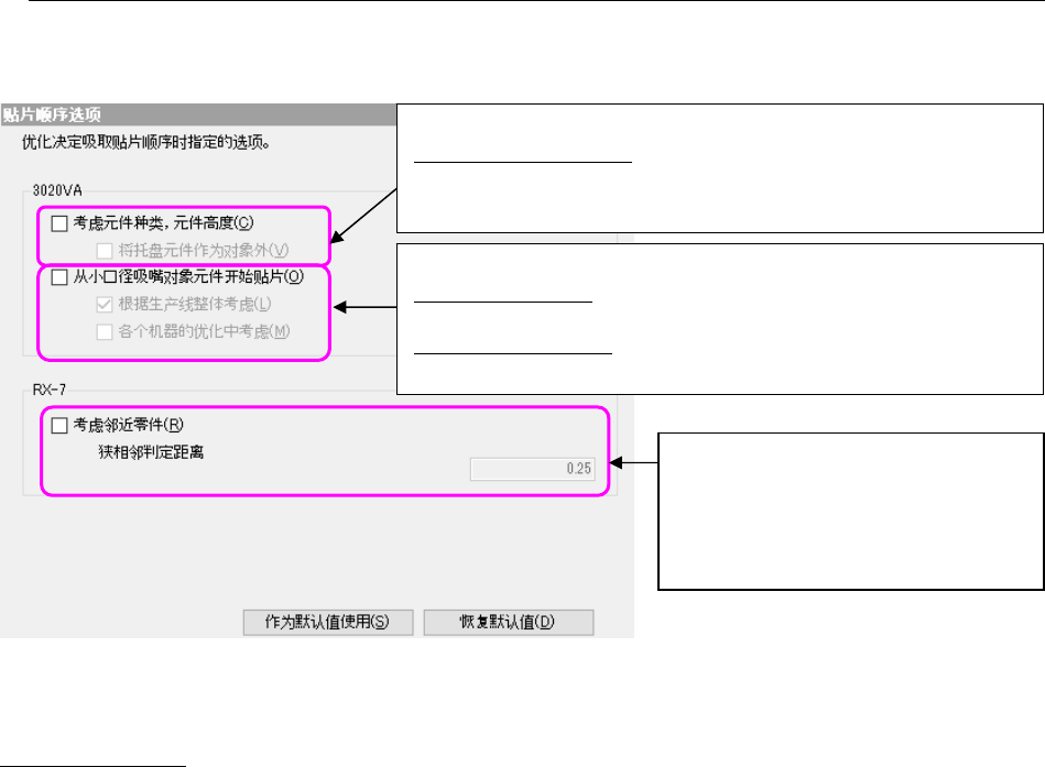 贴片顺序选项的「考虑元件种类、元件高度」及「从小口径吸嘴对象元件开始贴片」、「考虑邻近