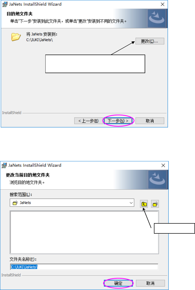 JaNets 使用说明书 2 安装 2-10 (3) 指定安装位置,单击「下一步」 。 不需要特别进行变更,请直接单击「下一步」 。 要变更安装位置时,选择安装位置,或直接输入,单击「确定」 。 要新建文件夹时,请单击「新建文件夹」 ,或直接输入文件夹名,单击「确定」 。 ※默认值为[ C:\ Juki \ JaNets ] 。 要变更安装位置时,请单击「更改」 。 新建文件夹按钮