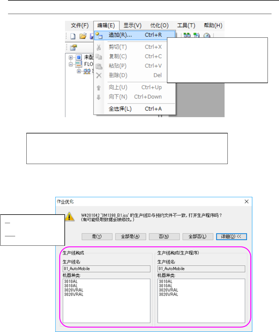 JaNets 使用说明书 8 作业优化 8-15 8-3-8 追加生产程序 8-3-8-1 从本地追加 图 8-3-8- 1 「编辑」-「追加」 生产程序的生产线 ID 与预约文件的生产线 ID 不一致时,会显示下列信息。 图 8-3-8- 2 「确认生产线 ID 」信息(显示生产线构成) 是: 由正在选择的生产 线打开生产程序。 详细: 显示数据库和生 产程序的生产线构成。 选择「编辑」‐「追加」→显示「追加文件」对话框 ※ 「追加文…