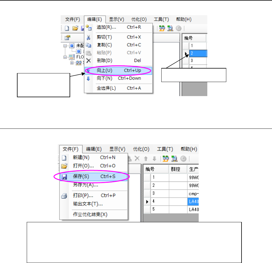 JaNets 使用说明书 8 作业优化 8-22 8-3-11 预约列表 - 预约的移动 进行下列①,②的操作。 图 8-3-1 1-1 主画面 ‐ 「编辑」-「向上」 8-3-12 预约列表 - 预约文件的保存 进行下列①或②的操作。 图 8-3-12 -1 主画面 ‐ 「文件」-「保存」 ①选择「文件」 - 「保存」 ②选择「文件」 - 「另存为」 ※从对话框②的初始文件夹, 会打开 「被选择的生产线预约文件夹 (在车间作业设置时设…