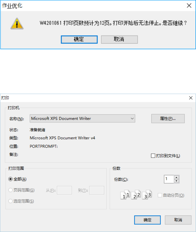 JaNets 使用说明书 8 作业优化 8-26 打印页数计算完后,打印页数超过 10 张时,会发出警告。 图 8-3-14 -7 打印页数警告 点击「确定」按钮,即显示下列对话框。 图 8-3-14 -8 「打印」对话框② 打印时请注意下列几点: ■ 打印将连续进行,张数多时,请事先进行确认。 ■ 打印方向,只支持作业优化所规定的方向。 ■ 不支持「输出文件」 。需要时,请使用下列项目的文本输出功能。 ■ 要将 XP S 、 PDF …