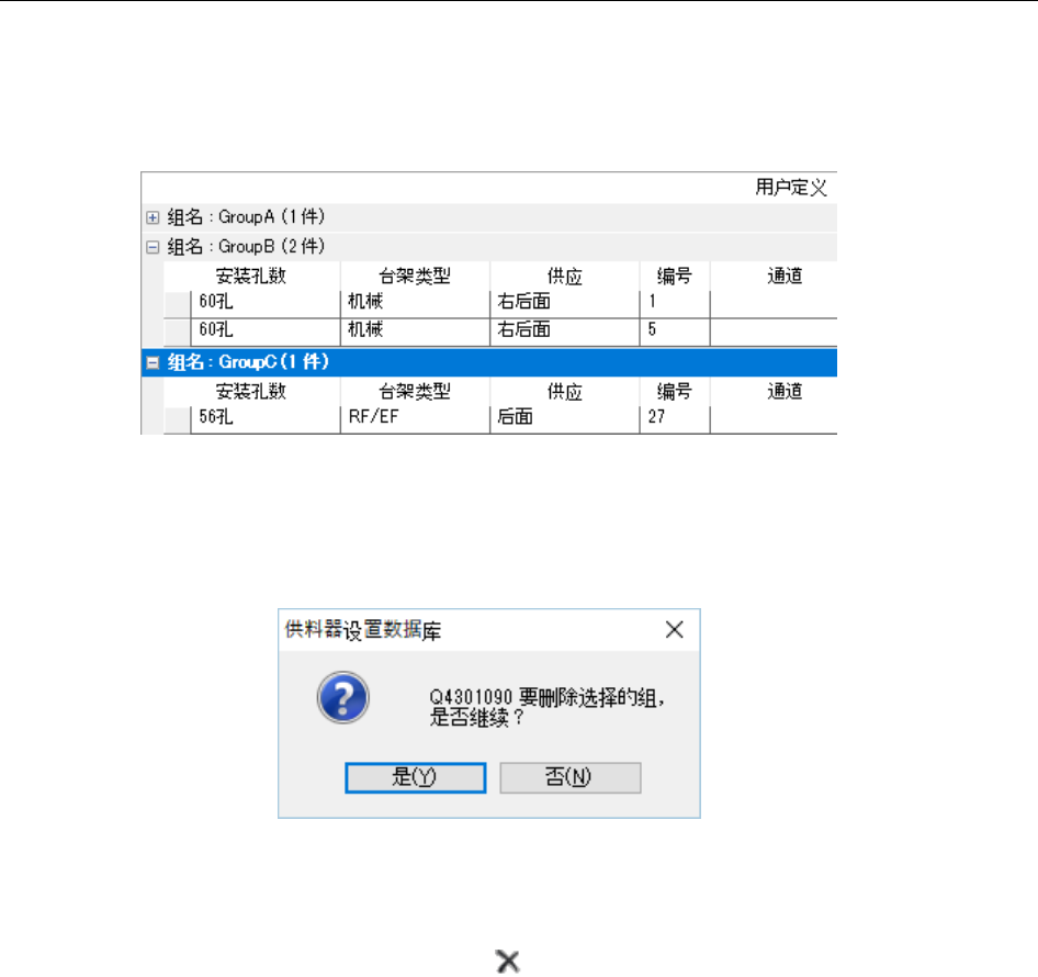 JaNets 使用说明书 10 供料器设置 数据库 10-10 10-3-7 删除供料器组 从数据库里删除管理的供料器组。 删除供料器组有如下方法。 1. 从用户定义一览表中选择要删除的组。 ( 可选多个 ) 图 10-3-7-1 选择供料器组 在该状态下,点击菜单的「编辑」 ‐ 「删除」即显示确认删除的提示信息。 图 10-3-7-2 确认删除供料器组 2. 从用户定义一览表中选择要删除的组。 ( 可多选多个 ) 在该状态下按下工具条…