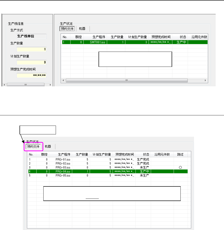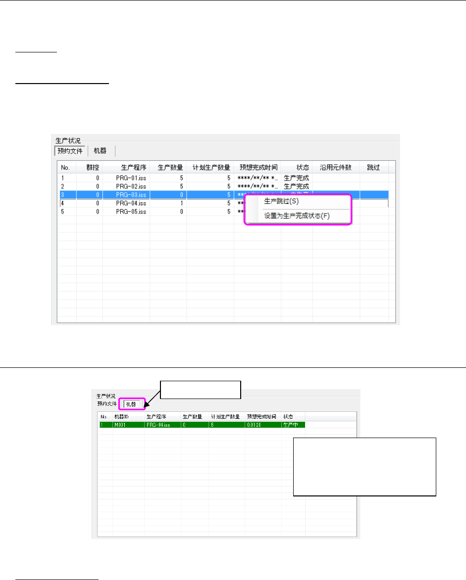 JaNets 使用说明书 13 程序下载 13-7 13-5-3 生产状况 图 13-5-3-1 生产状况 13-5-3-1 预约文件的生产状况 图 13-5-3-2 预约文件的生产 状况 显示预约文件中预约的生产程序、 各机器里生产程序的生产状况。 点击此选项卡 显示生产中的预约文件中已注册的生产程序的生产状况。可变更显示 项目及显示颜色( ⇒ 13-13