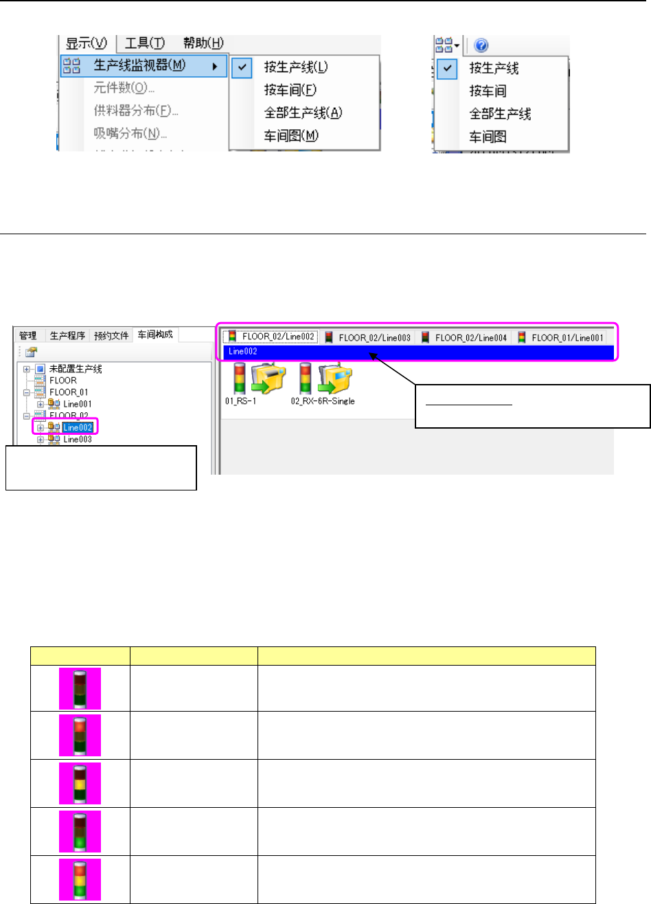 ※ 在选项卡里显示的信号灯会显示生产线的生产状况,只要有 1 个状况不同的机器,即按以下优先