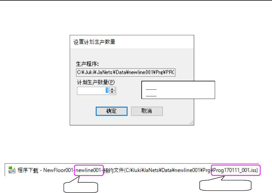 JaNets 使用说明书 13 程序下载 13-13 13-8-2 指定生产程序后的确认 指定生产程序,则会显示下面的设置计划生产数量对话框。 对于仅注册指定的生产程序的预约文件,要按 pd_ +指定的生产程序名的格式进行制作。 图 13-8-2-1 设置计划生产数 量对话框 为确认生产程序指定正常,标题栏显示如下。 图 13-8-2-2 指定生产程序后 的标题栏 ※ 显示有效(激活)生产线 的内容后, 「生产」菜单的「下载 」及工具条…