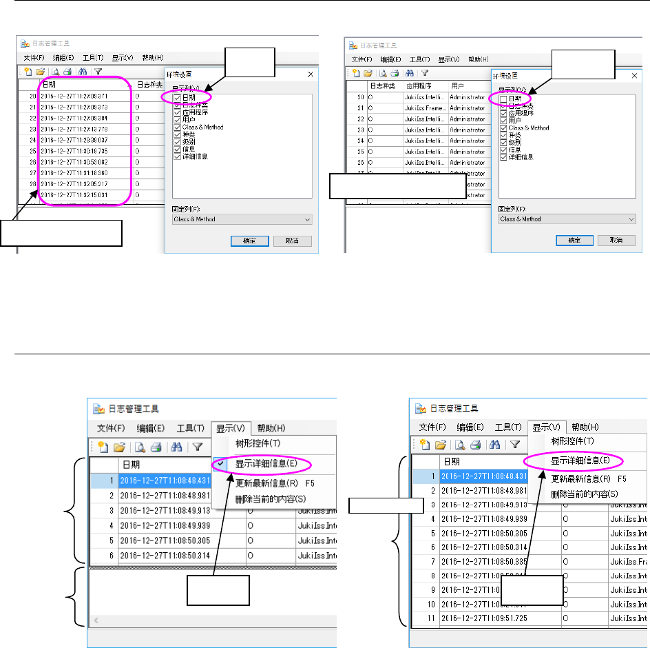 JaNets 使用说明书 15 日志管理工具 15-7 15-1-4-2 切换日志查看器项目的显示 / 隐藏 图 15-1-4-3 切换日志项目的 显示 15-1-4-3 日志详细信息的显示 / 隐藏 图 15-1-4-4 详细信息的显示 /隐藏 显示 < 日期 > 项目 隐藏 < 日期 > 项目栏 勾选 未勾选 日志显示栏 详细信息 显示栏 有勾选 日志显示栏 无勾选