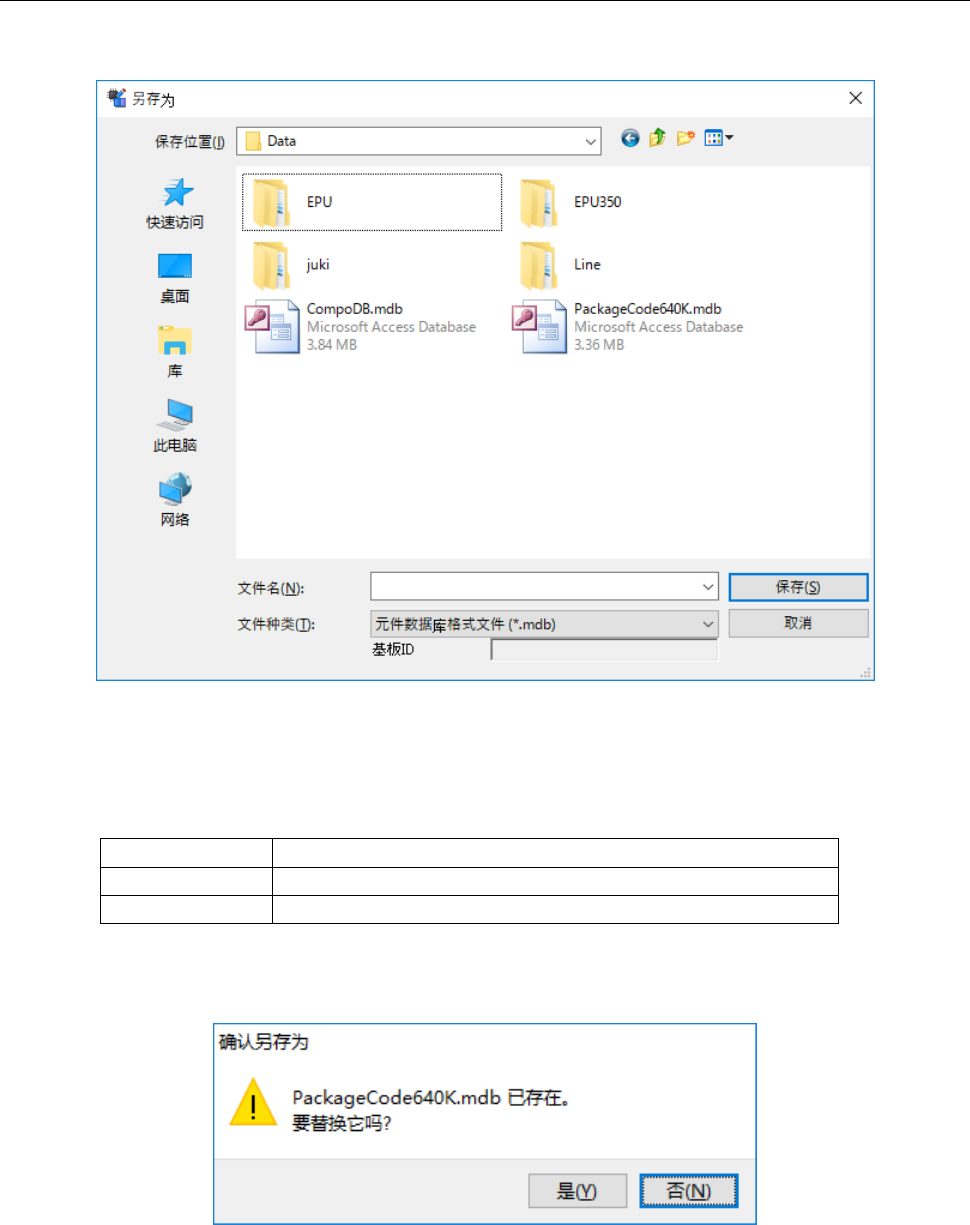 JaNets 使用说明书 1 6 程序管理器 16-21 16-6 导出 此功能可将元件数据及点胶数据导出至本体元件数据库格式的文件。 选择「文件」 - 「导出」 ,显示如下文件选择画面,指定导出的文件名。 图 16-6-1 另存为对话 框 可导出的文件格式如下所示。 表 16-6-1 可导出的文件格式 扩展名 文件格式 MDB 本体元件数据库 格式 FLX 本体元件数据库 包装代码文件 如果指定了已存在的文件,会显示是否覆盖的提问信息…