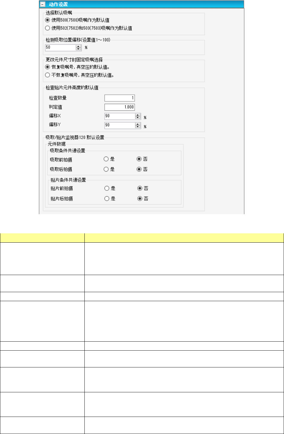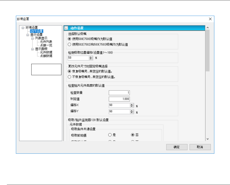 更改元件尺寸时固定吸嘴选择 更改元件尺寸时,选择是否恢复吸嘴编号和真空压的默认值。默认选择「恢复」。