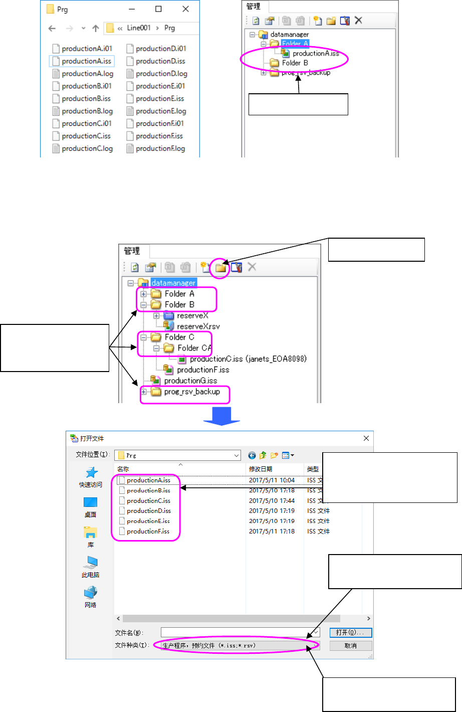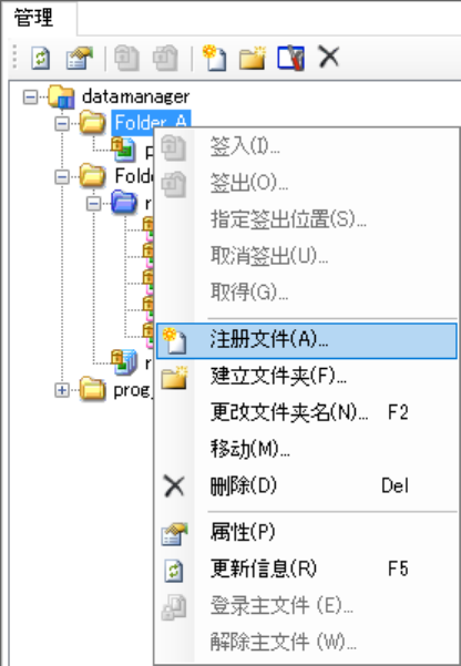 JaNets 使用说明书 1 7 程序管理器 17-13 3. 进行下面①至④的操作。 ①选择管理画面内的文件夹。 ( 不可选择多个 ) 。 ②点击鼠标右键,从显示的菜单里选择「注册文件」 。 ③显示出与 2. 同样的打开文件对话框,在对话框里选择要追加到数据库里的文件。 ④显示出文件注册确认对话框,操作后则会注册到数据库里。 图 17-3-1-1-5 右击鼠标显示的菜单「注册 文件」 ※ 追加时可选择的文件种类,仅限生产程序( *.i…