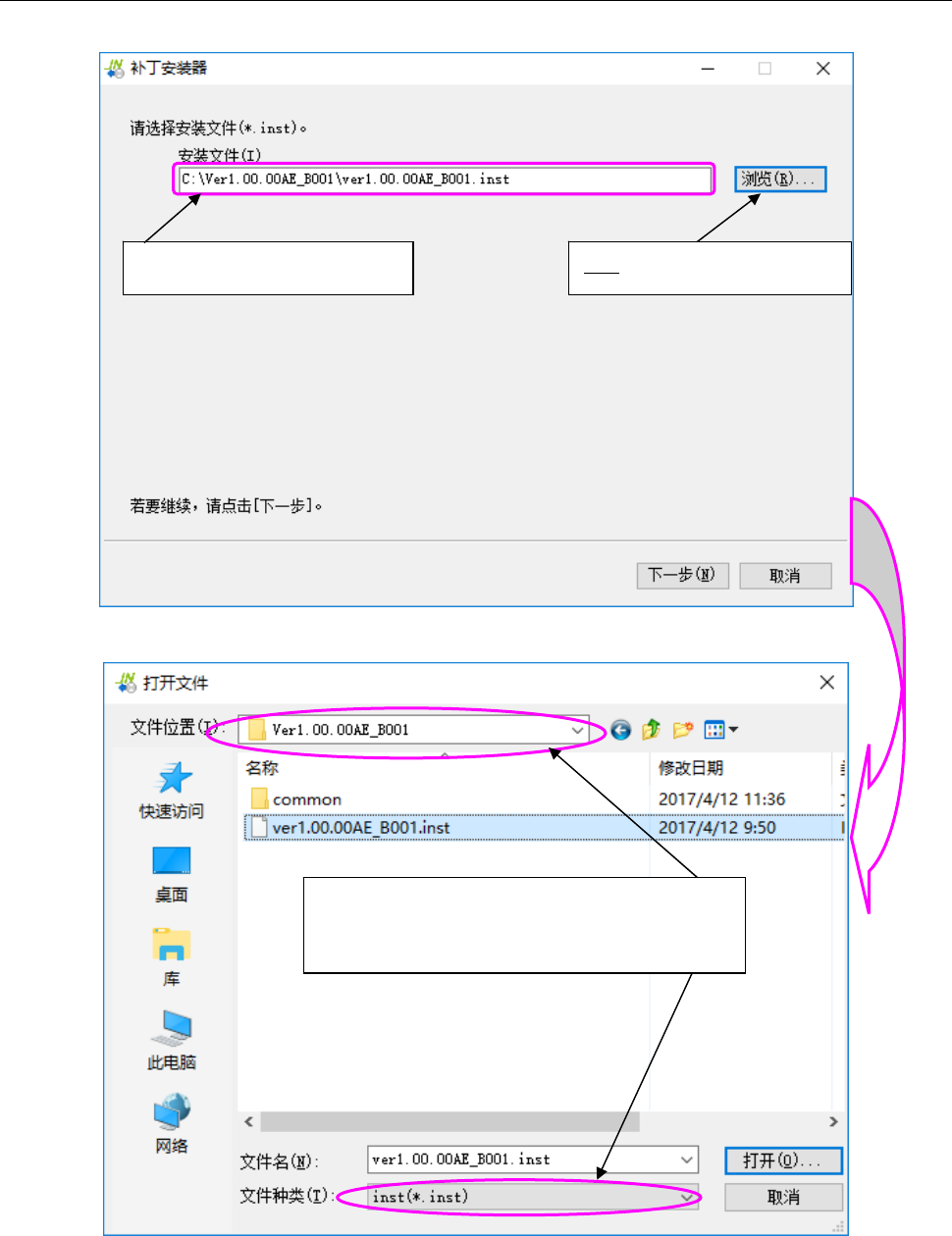 (补丁安装器文件*inst 格式的文件) 后,选择文件名,