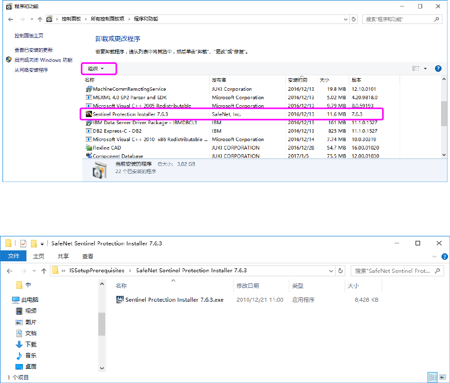 (2) 从 PC 上已安装的程序列表中选择「Sentinel Protection Installer 7.6.3」,执行卸载。