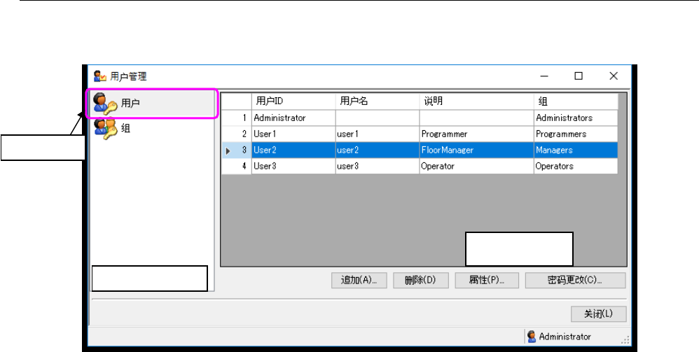 JaNets 使用说明书 4 用户管理 4-2 4-2 用户管理 追加用户,或更改现有用户的设置。 图 4-2-1 用户管理画面 ※ 组不存在时,不能追加用户。 没有「编辑用户 / 组」的操作权限时,也不能进行操作。只可浏览。 ※ 用户 / 组的最多可注册个数, 包括默认的用户 「 Admi nistrator 」及 组「 Administrator 」各 为 100 个。 列表显示区域 选择用户 设置项目显示区域