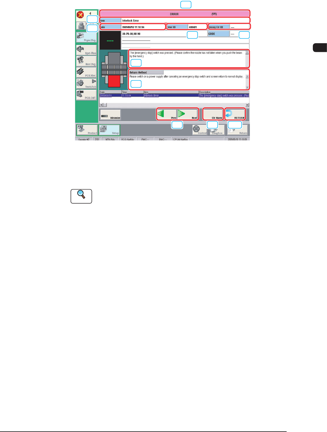 4OM-1610 2-34 4. "Error" Window : Chap.2 [6] Date, T ime In this text box, the data and time when the error occurred are described. [7] Error Description Page The total pages for the error description and curre…