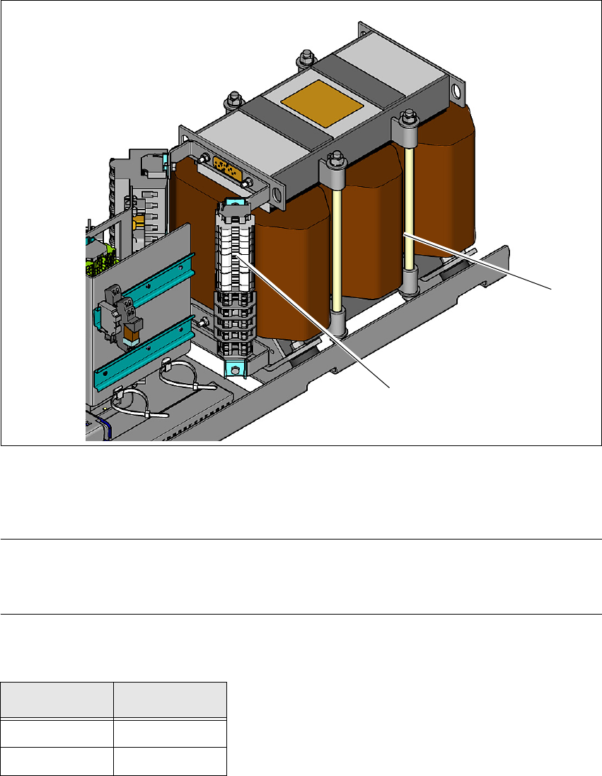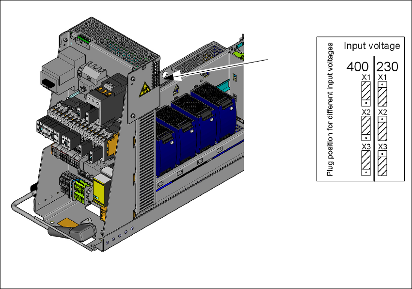 → 변압기의 유입 전류 제한 회로에 대한 커넥터 할당을 점검합니다 . 모든 본선 전압용 커넥터