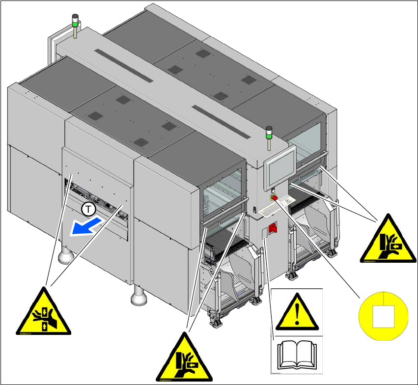 SIPLACE SX4 장비에 대해 보여줍니다 . 경고 라벨의 위치는 SIPLACE DX4 의 경우와 동일합니