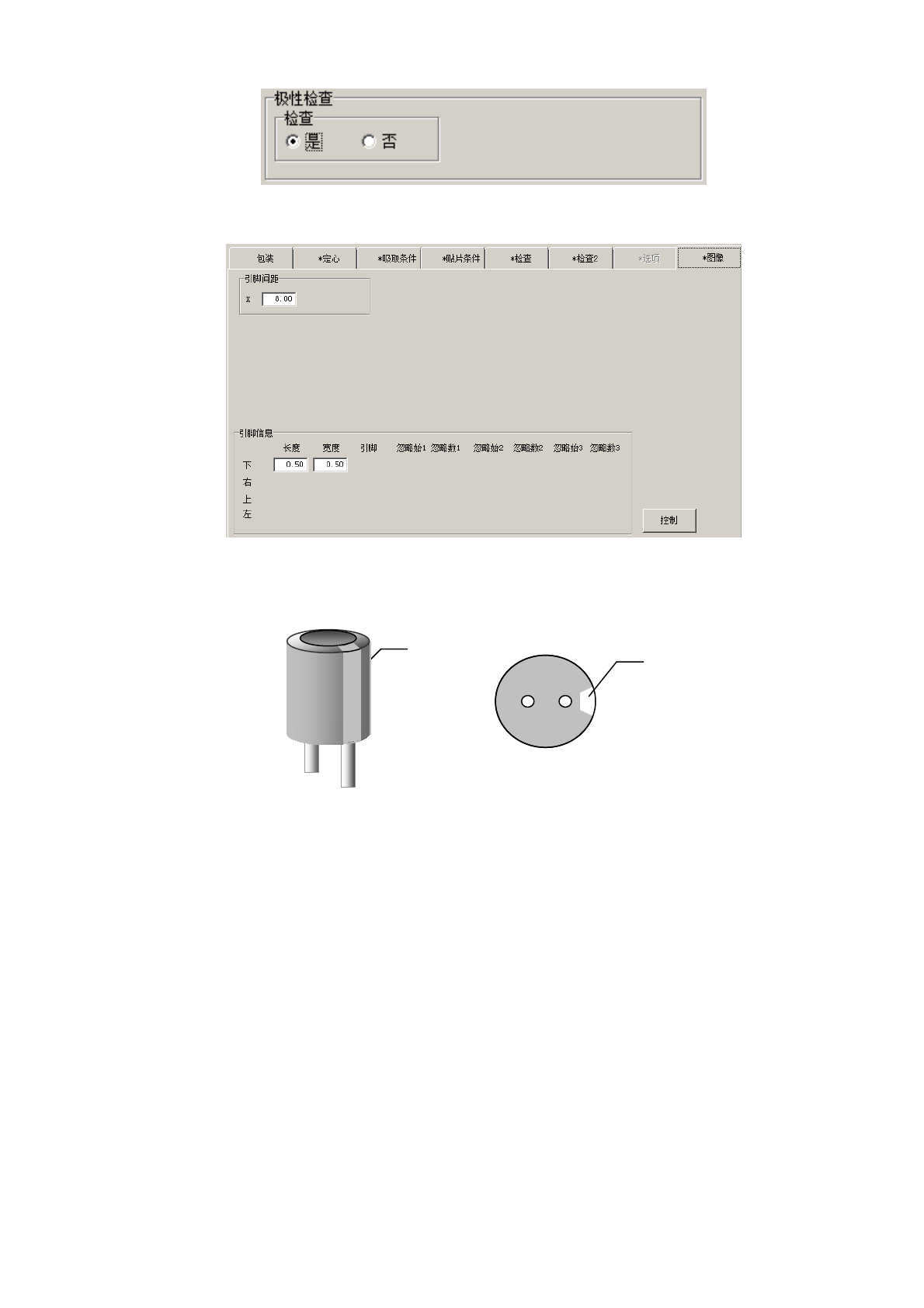 是否实施极性检查,从图像选项卡设定引脚间距、引脚长度・宽度。