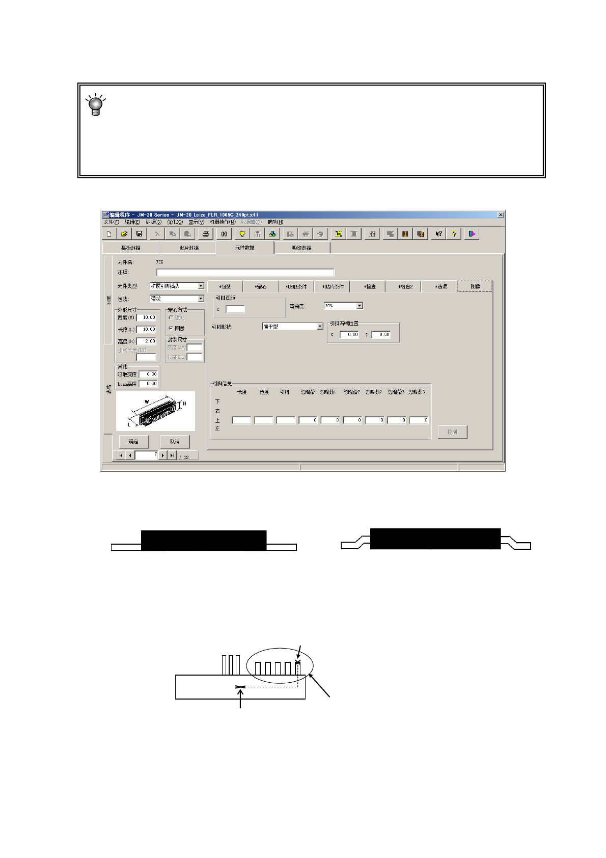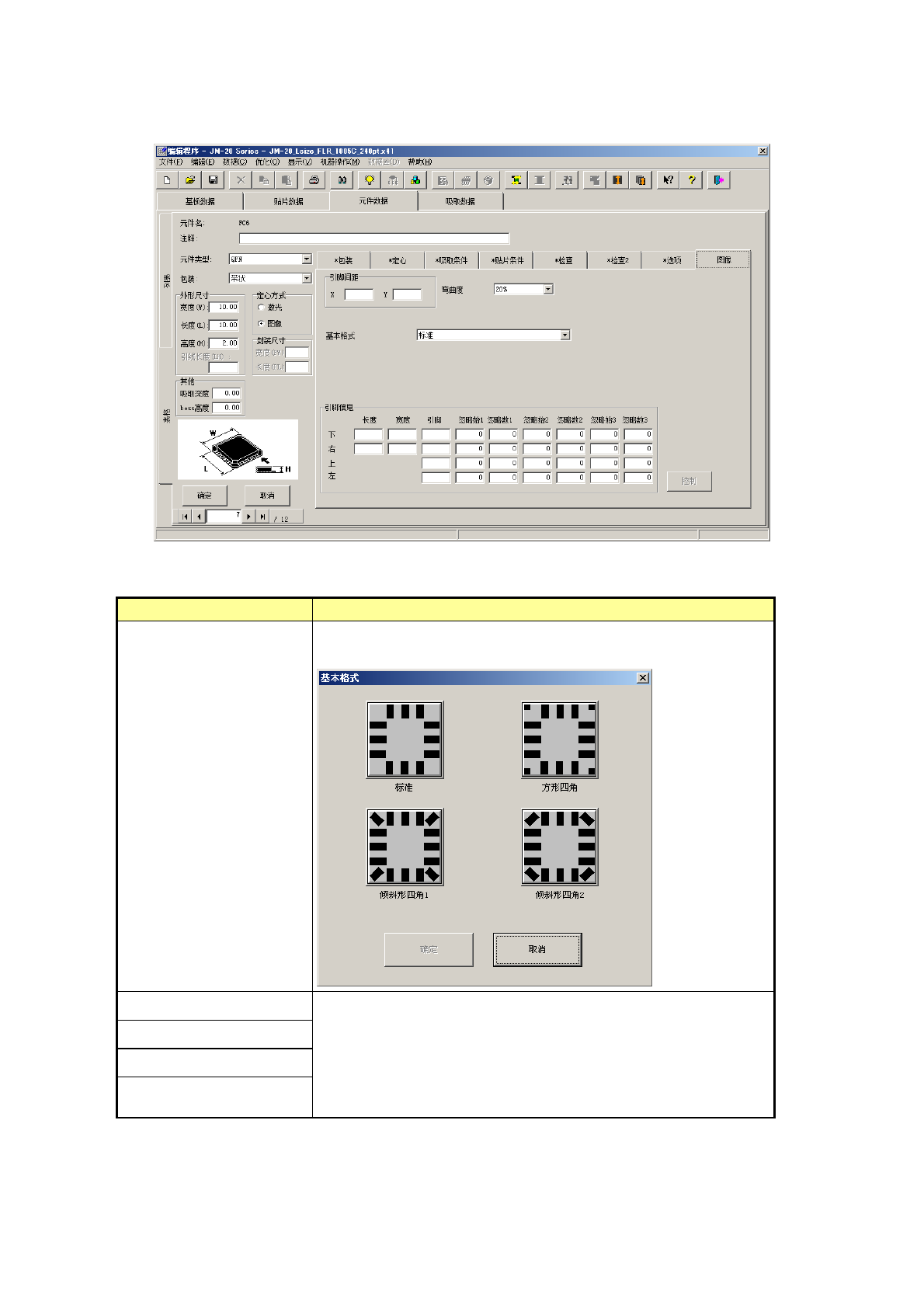 操作手册 Ⅱ 2- 128 ( 4 )元件类型 Q FN 时 基本格式以外的 项目,与引脚元 件的设置 相同。 1) 基本格式 弹出式菜单 / 下拉式 列表 基本格式 浏览 显示标准~标记 溢出的样本图形 。 也可从显示的画 面里选择基本格 式。 标准 请选择 与元件垫片( Land )形状 一致的图 ( 或接近的图 ) 。 4 角的垫片( Land )部分作为 “ 元件引脚图案 ” 不进行 识别。 “ 标准 ” 型 4 角没有垫片( …