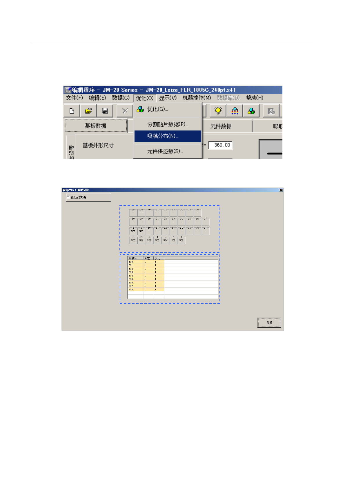 执行优化后,可安排该机种可使用的定心方式、吸嘴编号。