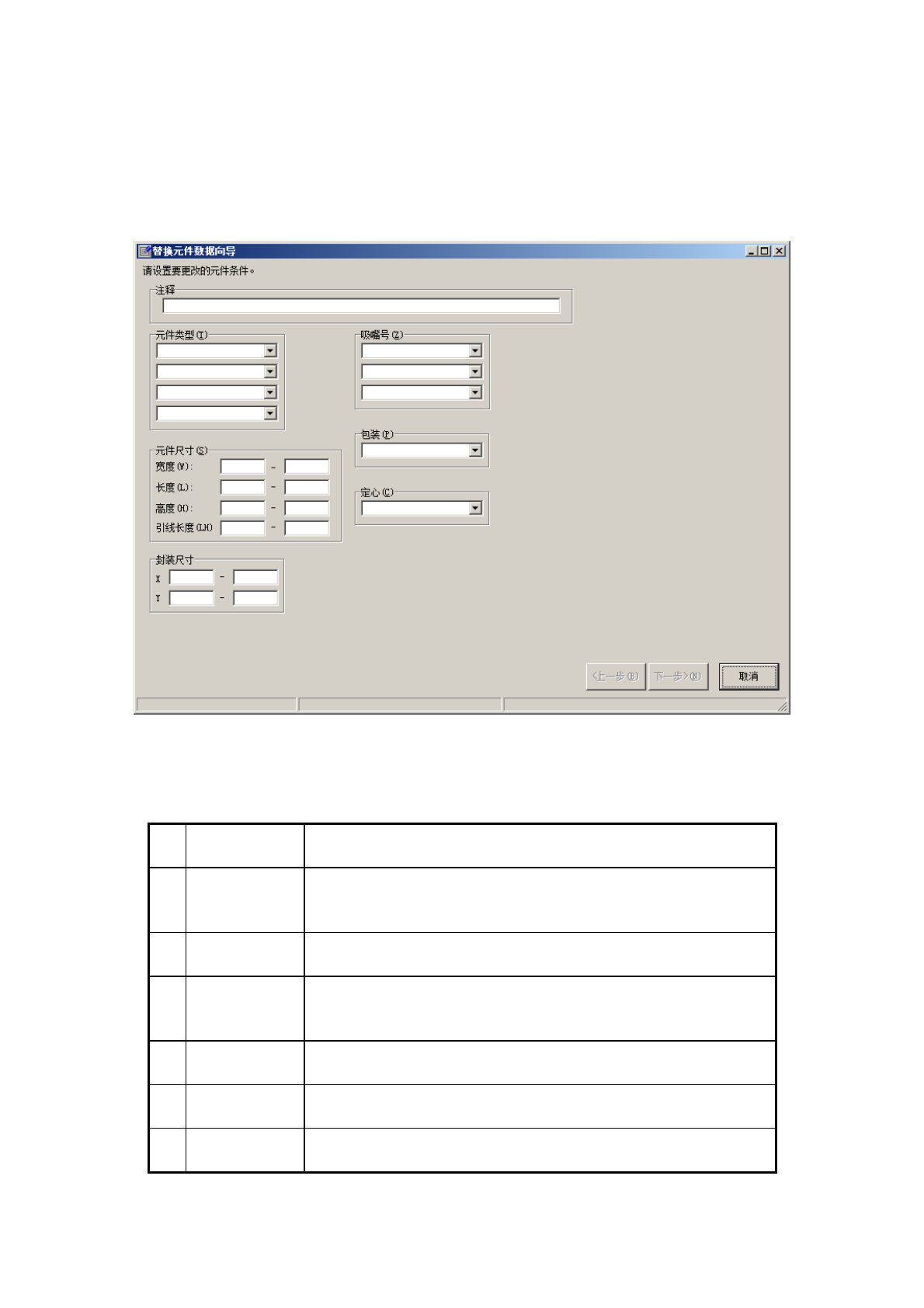 此功能可使用指定的条件统一替换指定的全部元件的「元件数据」中的“包装”、“定心”、“吸取条