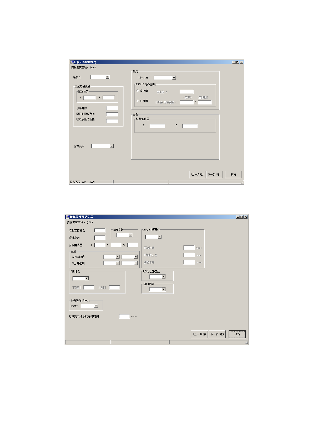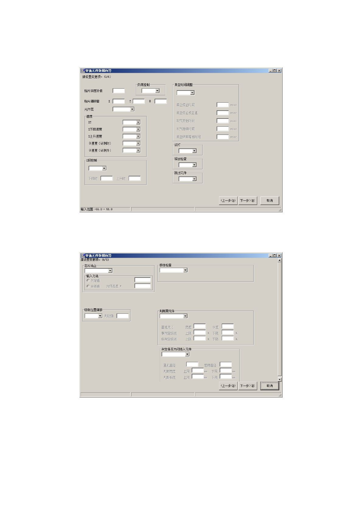 操作手册 Ⅱ 2- 170 2) 设定替换值 ① 显示元件数据的 [ 定心 ] 选项卡画面。 逐一输入需要变 更的数据,单击 「 下一步 」。 ② 显示元件数据的 [ 吸取 条件 ] 选项卡内容 。 逐一输入需要变 更的数据,单击 「 下一步 」。