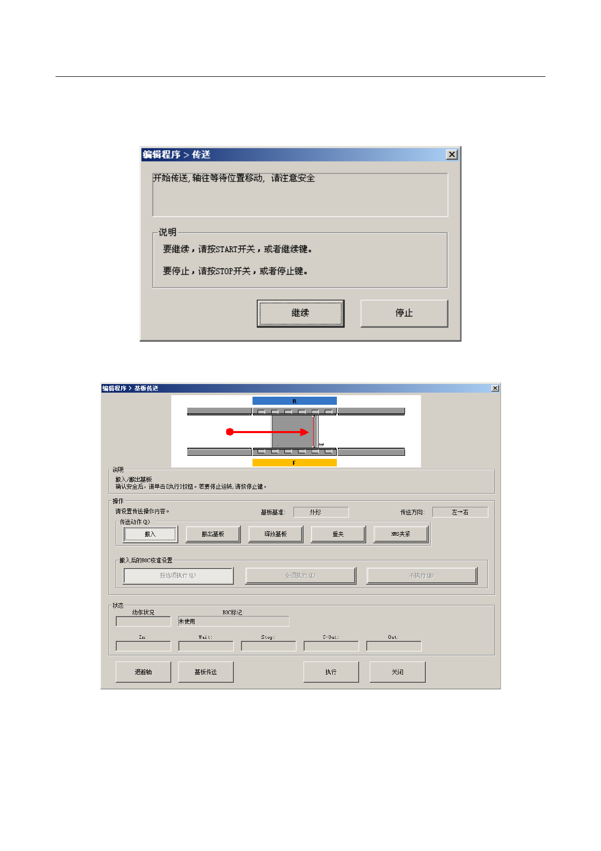 操作手册 Ⅱ 2- 221 2-5-4- 1 传送 2-5-4-1-1 基板控制 可进行基 板的搬入、搬出。 选择菜单 后, 如 果安全盖 在打开的状 态, 为了将轴移 动到安全 位置等 待,会显示如下 画面。 请确认安全后, 按下 [ 继续 ] 按钮。 将轴移动到安全 位 置等待后 ,会显示下列基板 传送画面。