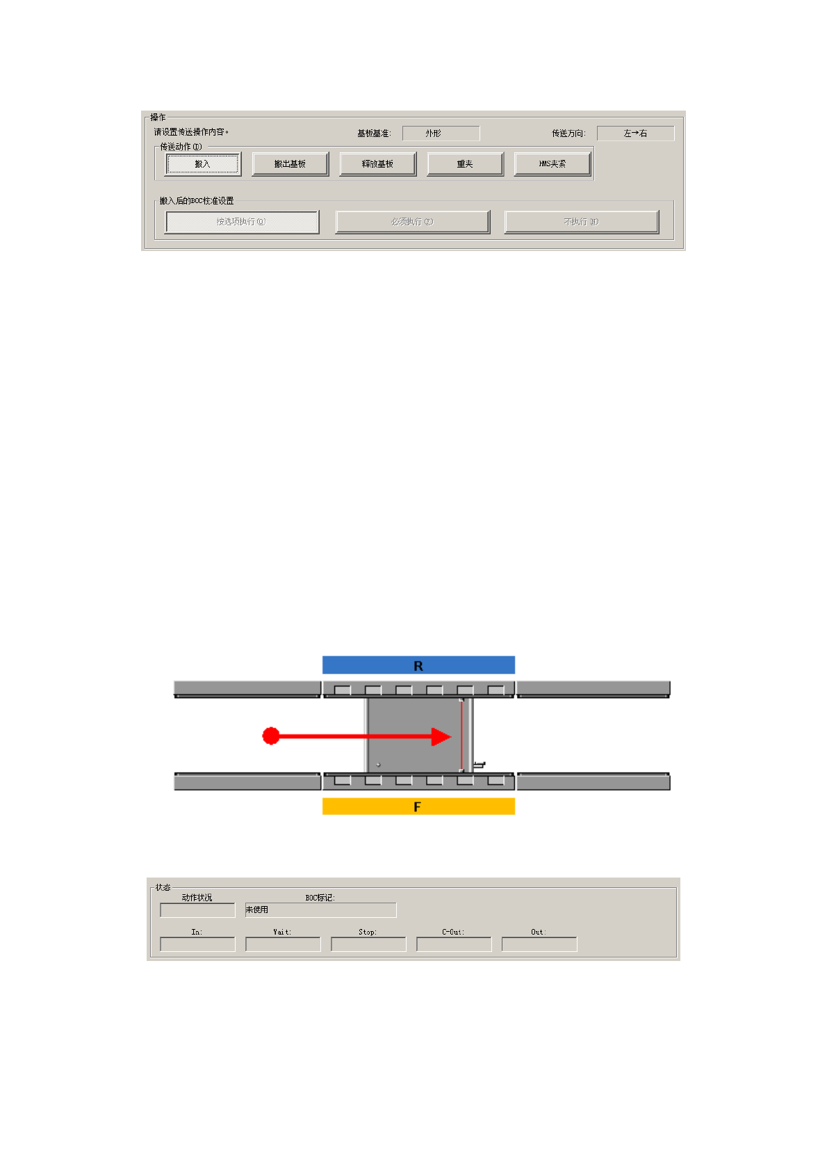 选择传送动作。可选择搬入、搬出基板、释放基板、重夹、HMS 夹紧(L 规格:选购项、XL 规格: