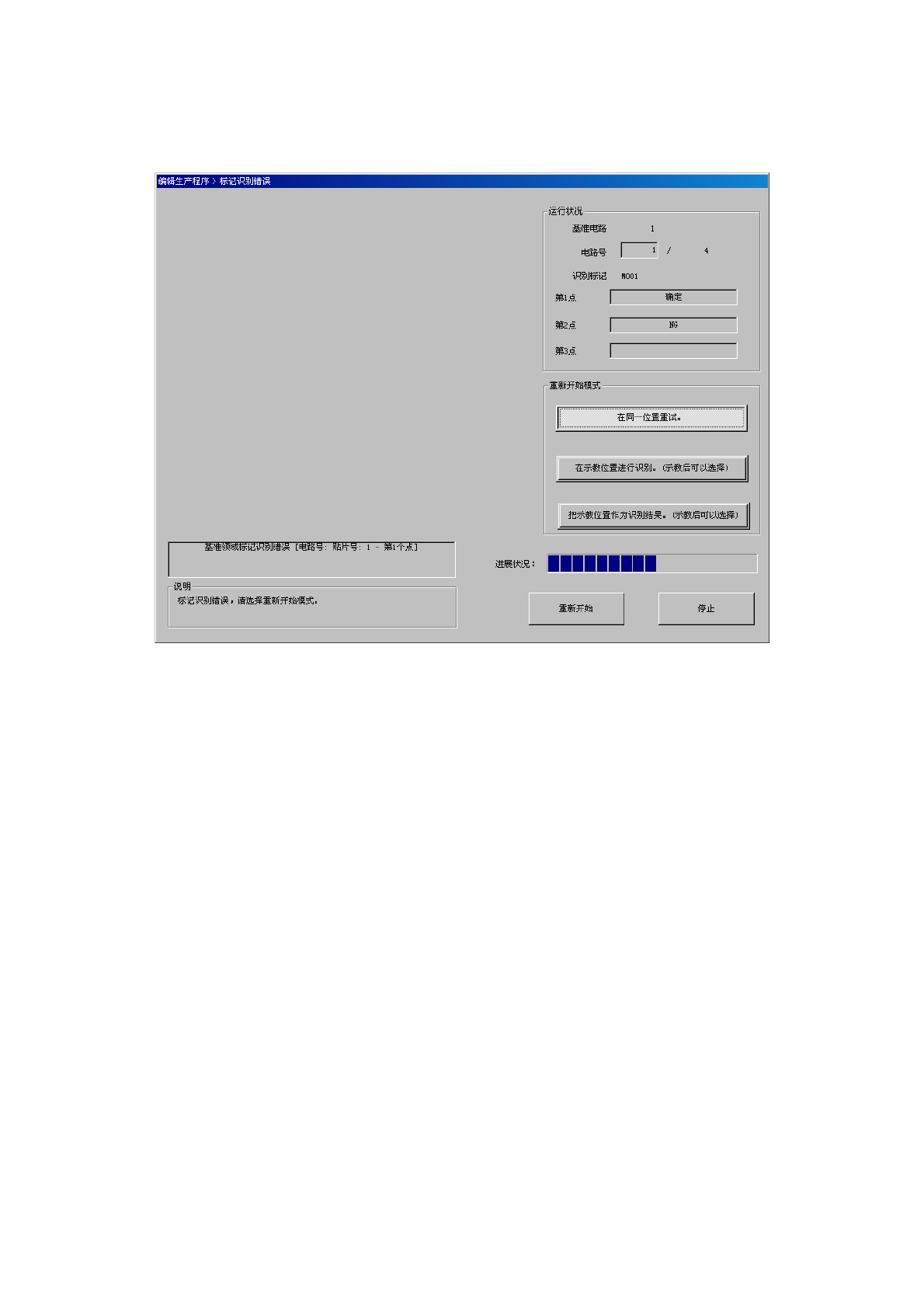 当执行基准领域标记识别失败时,会在画面的[说明]栏中显示提示信息,可以选择[重新开始模式]项