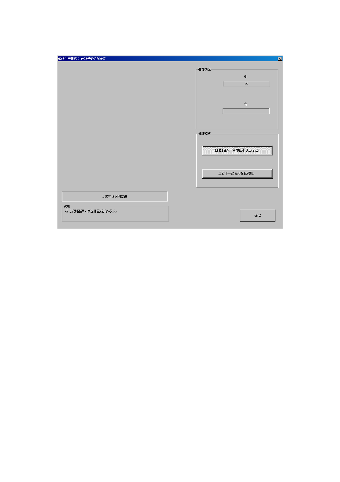 操作手册 Ⅱ 2- 273 2 ) 说明、动作模式 当识别台架标记 失败,画面的 [ 说明 ] 栏显示 提示信息时 ,可以选择 [ 处理模式 ] 的项目。 发生错误时,识 别结果不会被记 忆。 请选择在以后什 么时间识别标记 。 a ) 供料器台架下降为止 不校正标记( 使用默认的位 置) 将默认值适用于 发生识别错误的 台架的坐 标,视为完成识 别。 b ) 进行下一次台架标记识 别 将发生识别错误 的台架作为未识 别处理。 因此,不…