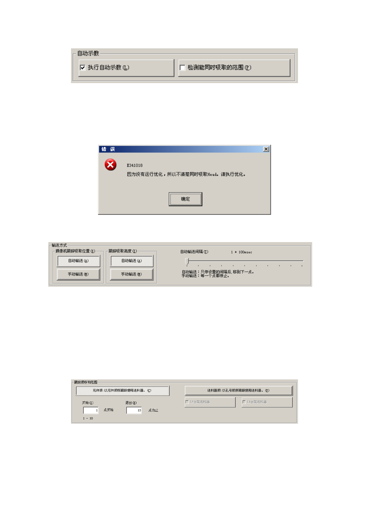 操作手册 Ⅱ 2- 281 2-5-4-7-2 吸取位置 / 吸取高度 通过摄像机 跟踪吸取位置。 确认监视器中显 示的吸取位置, 当输入坐 标不准确时,可 通过示教进行 修正。 此外,可 以通过使用 H MS 跟踪吸取高度 。此时,画面 上依次显 示从 H MS 获得的 检测值。 当高度有明显差 异时,请与坐标 示教一样 ,进行高度值示 教。 (1) 设置条件 从菜单栏中选择 「 机器操作 」 / 「跟踪 」 / 「吸取 位置 」 ,…