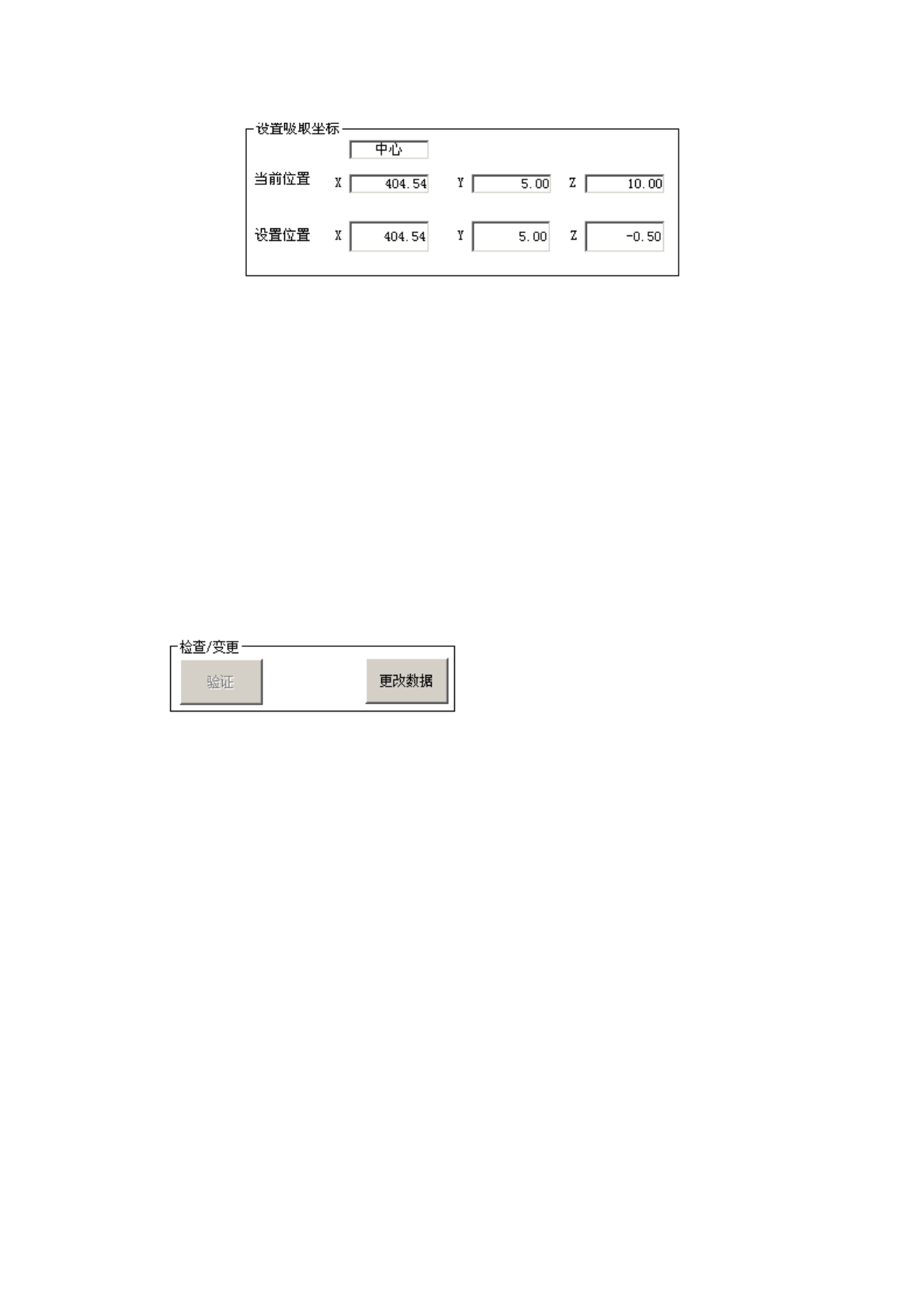 操作手册 Ⅱ 2- 286 3) 设置 吸取坐标 a) 当前位置 是跟踪中的元 件吸取位置的 X YZ 坐 标。 元件位置,显示 元件的 4 角或吸 取位置的中央 。 CENT ER : 显示元件的中 央。 TOP -L : 显示元件的左上 角。 TOP - R : 显示元件 的右上角。 BTM -L : 显示元件 的左下角。 BTM - R : 显示元件 的右下角。 b) 设置位置 设置位置是指在生 产程序里设置 的吸取坐标。 坐标值…