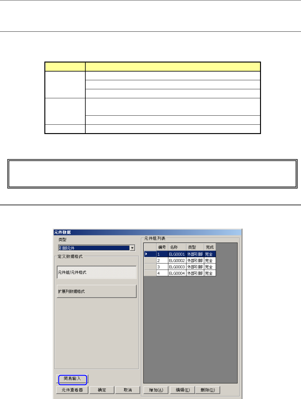 在元件要素数据画面中选择了元件要素的“类型”后,再选择「简易输入」,则显示元件要素组