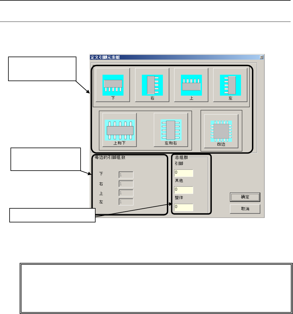 操作手 册Ⅱ 3- 21 3-4- 3 引脚元件类的制作方法 3-4- 3- 1 引脚元件要素组定义画面 从元件要素数据画面 中选择 “ 引脚元件 类 ” ,则显示 如下的 “ 引脚 元件要素组定义 ” 画面。 指定与元件形状相同 的模板后,在 “ 各 边的引脚组数 ” 中输入元件要素组 的数量。 输入后,选择「确定 」。 ※ 注 : 如果在引脚元件要素 组定义画面中定义 了元件要素组 并按下 OK 结束运行, 则从下一 次开始, 即使…