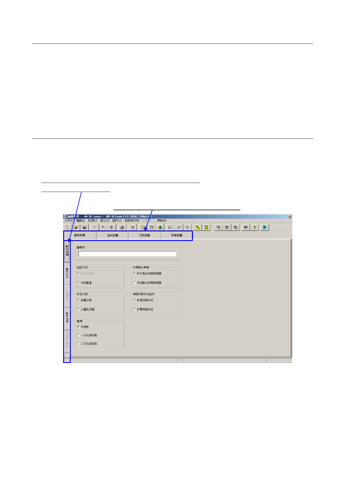 操作手册 Ⅱ 2-9 (2) 定位方式 ◆ 定位孔基准 : 当基板上有定位销插 入孔时, 把基准销插入该 孔中进行 定位 ( 定心 ) 。 如果选择定位孔 基准时,必须设 置为可使 用基准针。(可 选项) ◆ 外形基准 : 采用机械固定基 板外围的方式, 决定基板位置 。 不使用基板定位 孔。 (3) 标记识别 基板全体标记 ( BOC 标记及区域标记) BOC 标记的识别有 2 种 方法可供选择 。 请根据 B OC 标记 的 状态进…