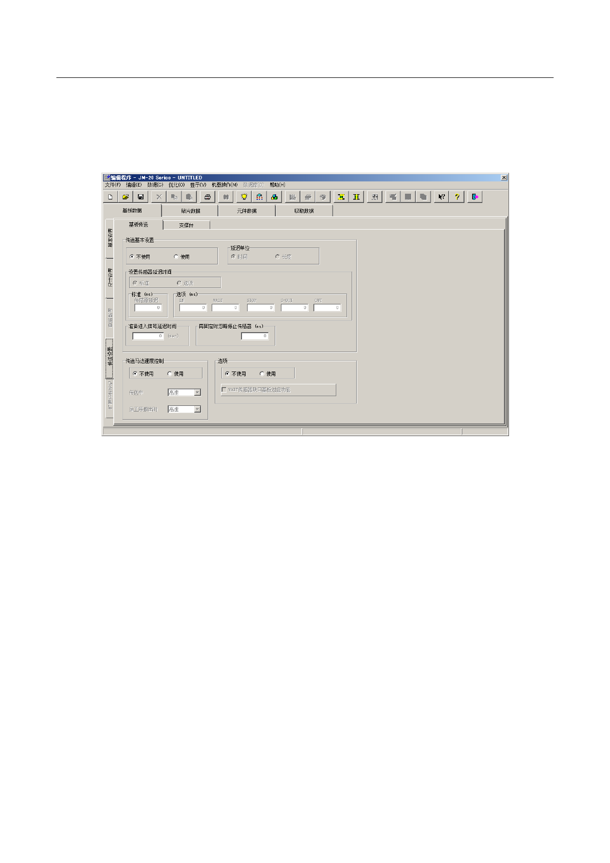 「传送设置」选项卡由“传送基本设置”、“传送马达速度控制”、“选项”等项目组成。
