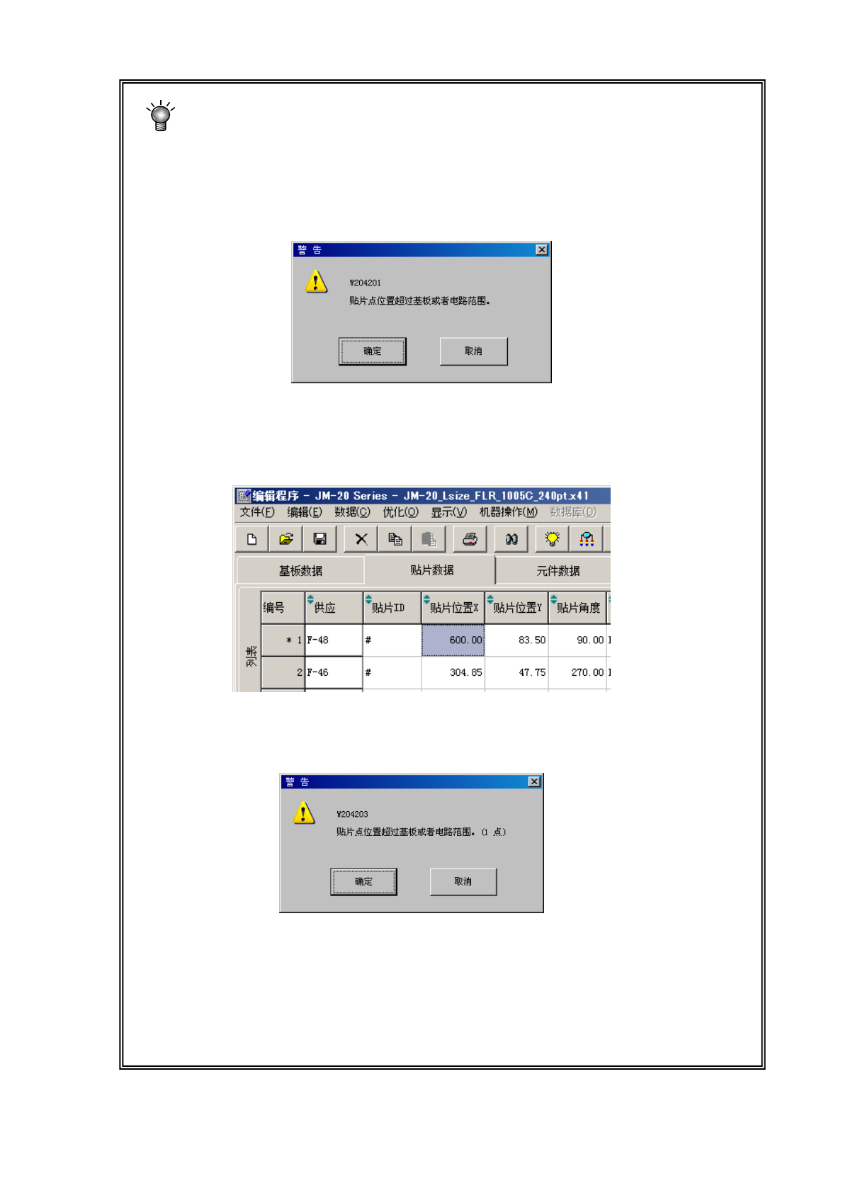 在输入贴片位置 X 或 Y 时,或分别进行了改变时,将进行范围检查。
