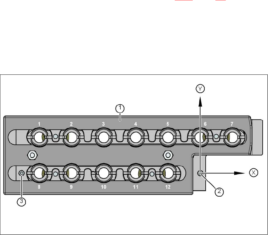 Rys. 6.1 - 8 Magazynek pipet - numeracja garaży, znaczniki do wyznaczania pozycji i położenia kątowego