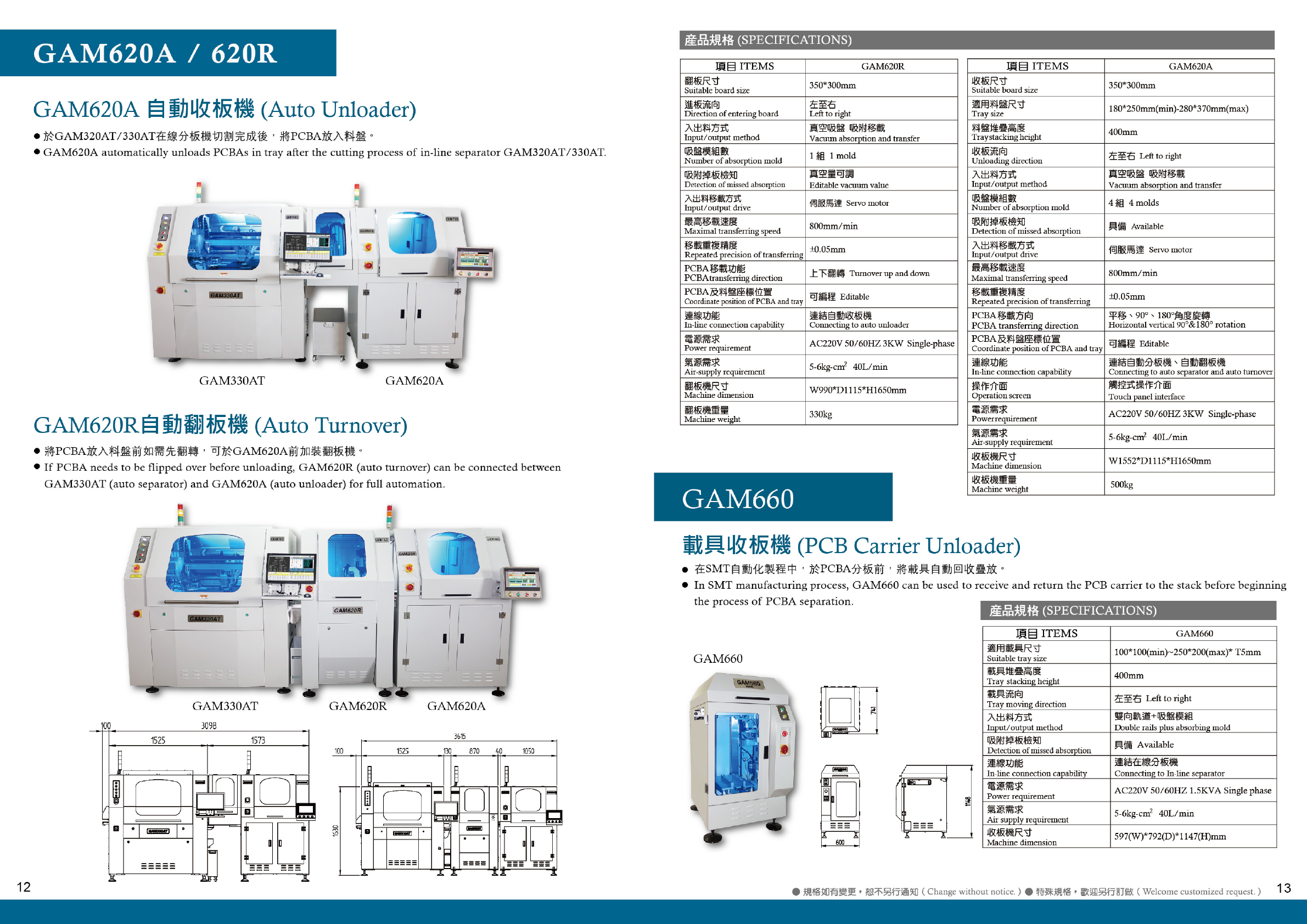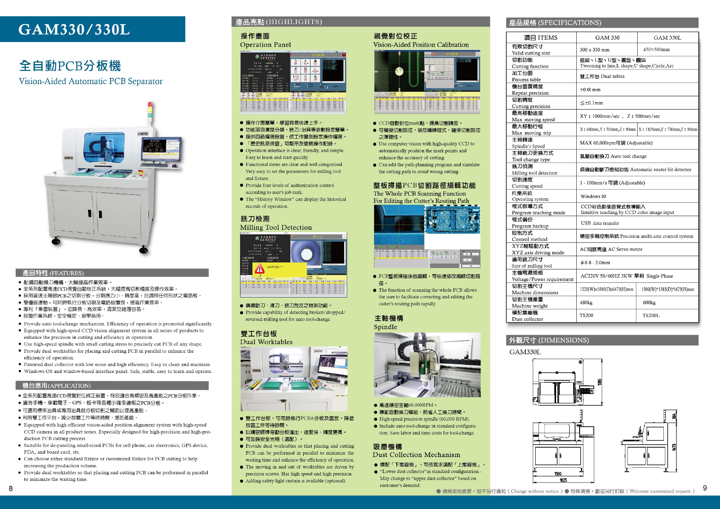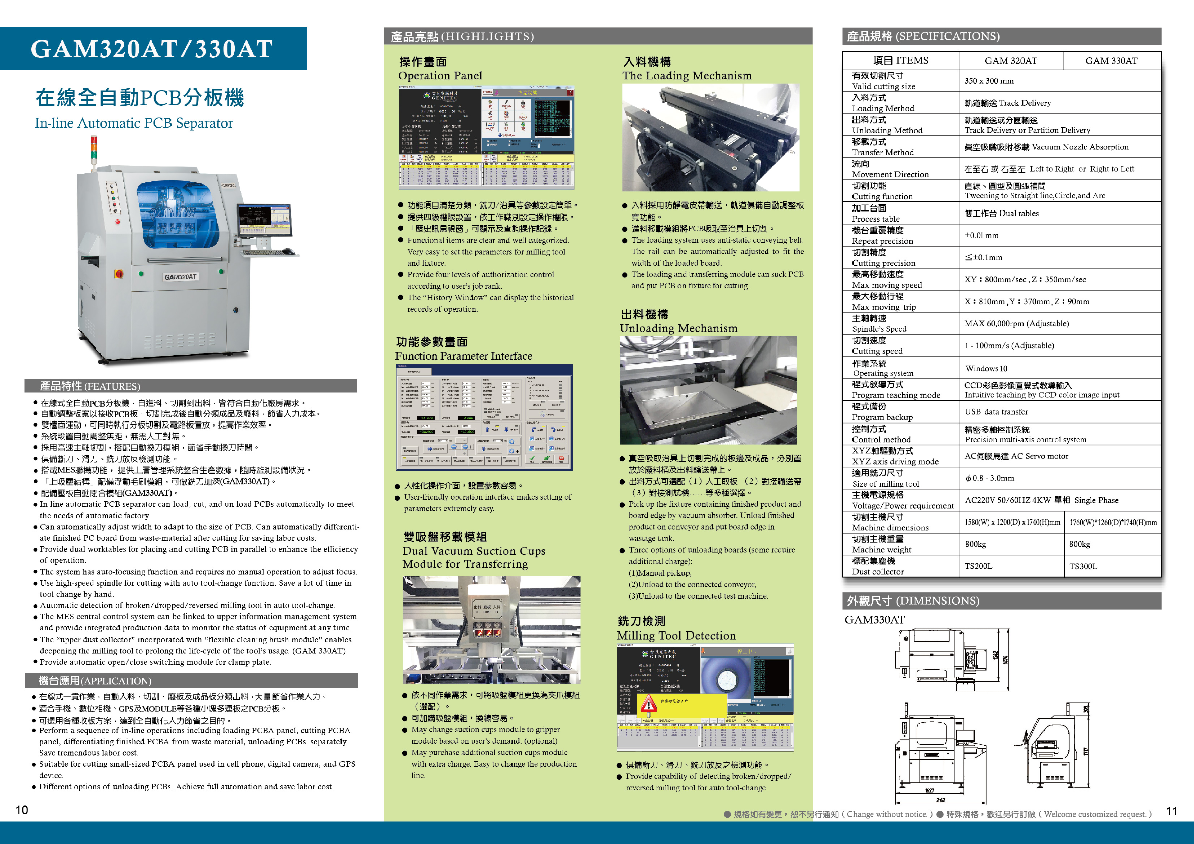 產品亮點 ( HIG : 産品規格 ( SPECIFICATIONS ) GAM 320 AT / 330 AT 項目 ITEMS 操 作 畫 面 入 料 機 構 GAM 320 AT GAM 330 AT The Loading Mechanism Operation Panel 有效切割尺寸 350 x 300 mm Valid cutting size 在線全自動 PCB 分板機 入料方式 Loading Method 軌道輸送 …