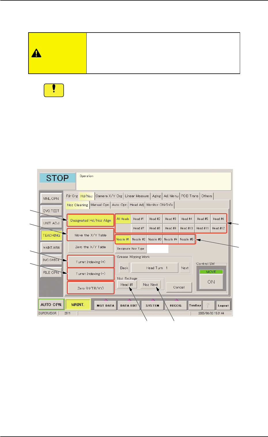 (1-4) Select the [Designated Hd/Noz Align] button (*3) and press the [ON] button (entitled "MOVE"). In 2 seconds, press the [ENABLE] button on the operation panel. The nozzle is shifted to the position (the fro…