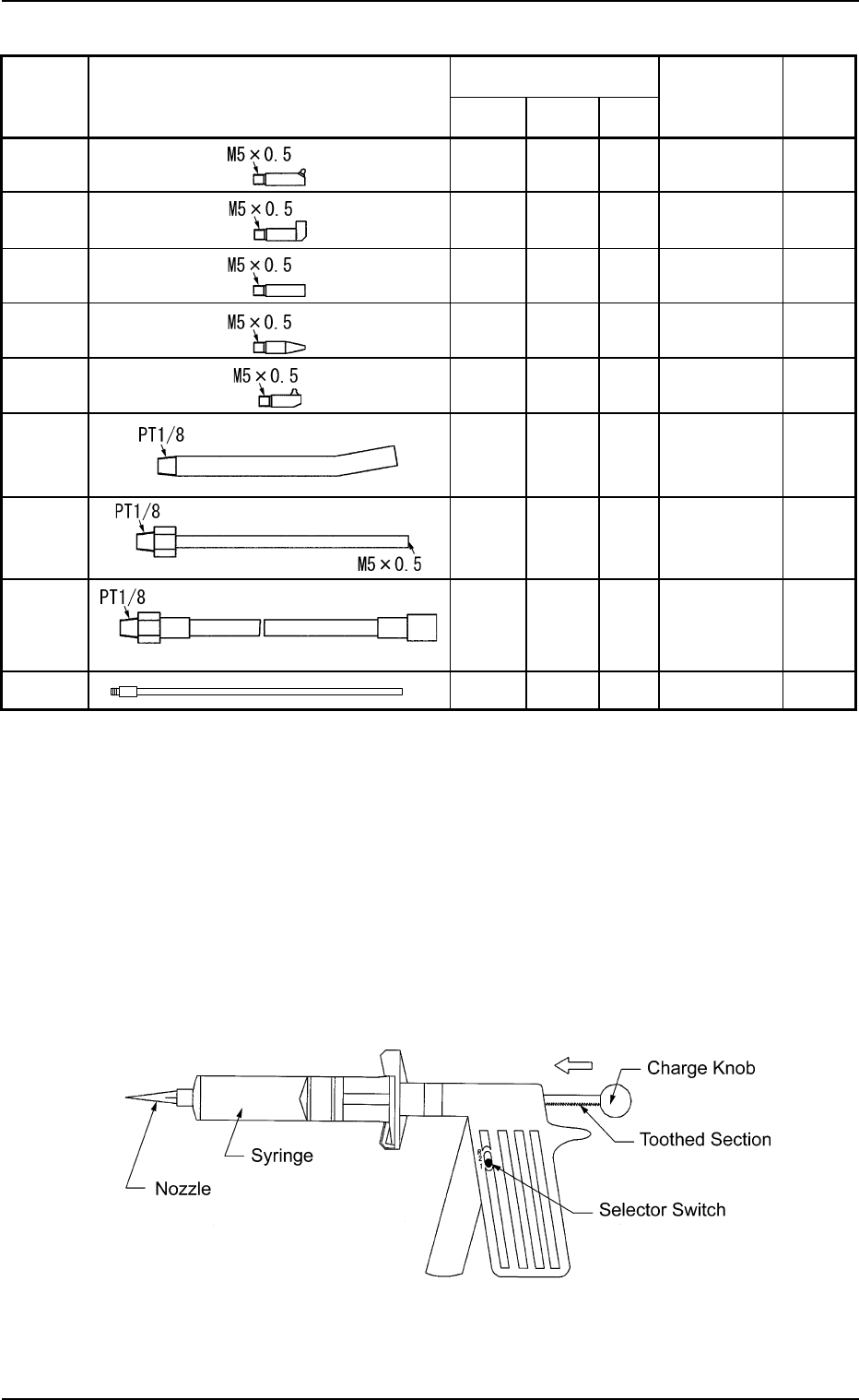<Contents of Kit> T able 4A6 Part Name Q’ty Dispense Gun (Main Body) for 10 cc 1 Syringe 20 Piston 2 0 End Cap 20 Syringe Cap 20 Usage (6-1) Set the selector switch to "1" in normal cases. Note: When the …