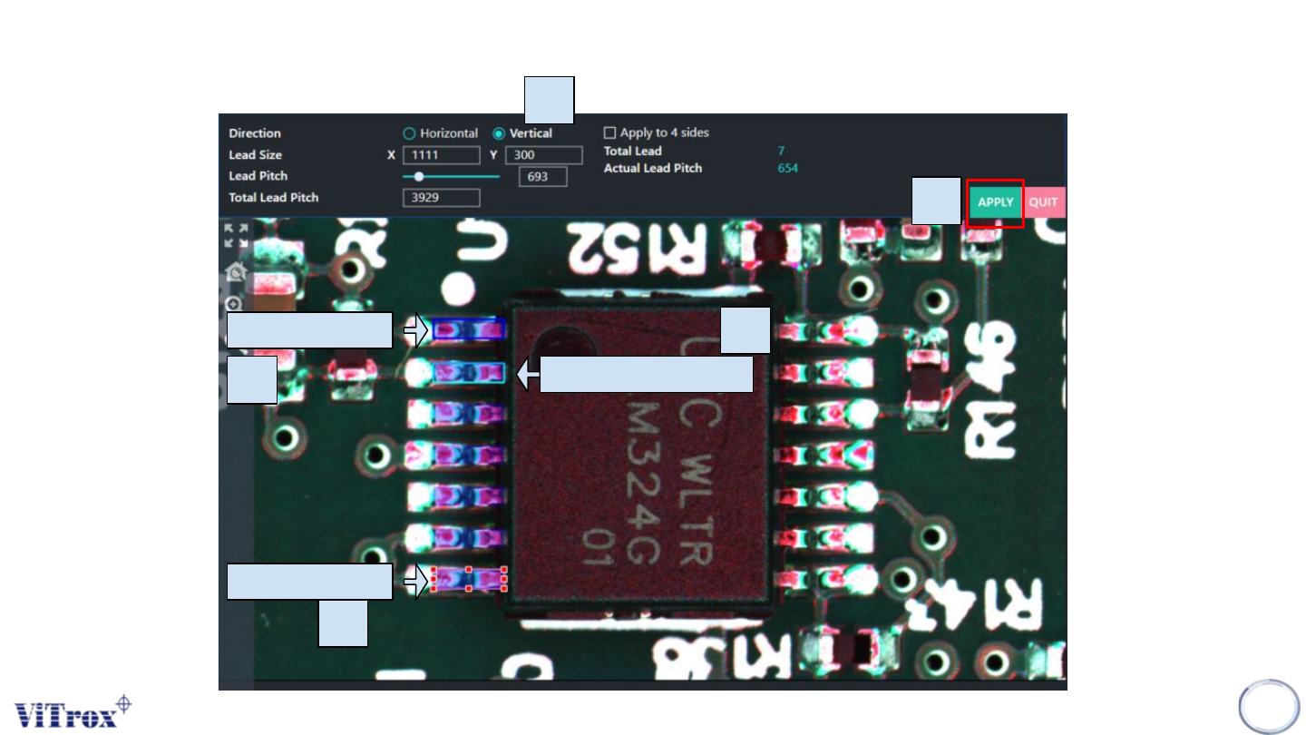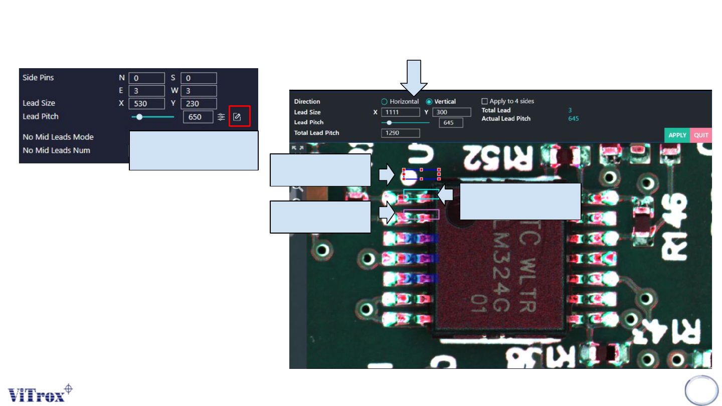 Copyright © ViT rox All Rights Reserved . Orientation Blue lead box: 1st lead Pink lead box: Last lead Light blue lead box: 2nd lead 1. Click “Edit” button in Lead Pitch setting. 2. Define “direction” of lead. 3. Put the…