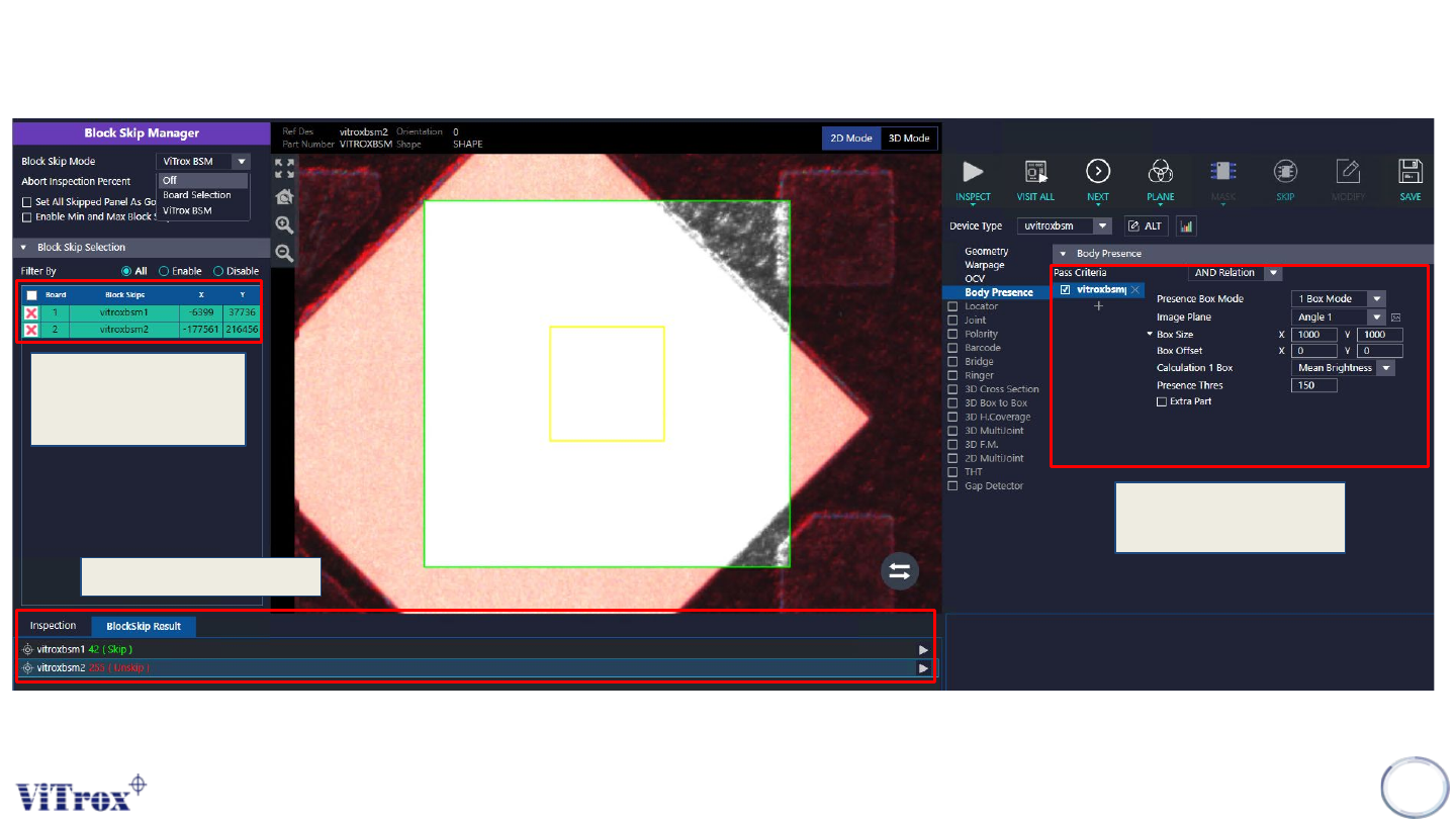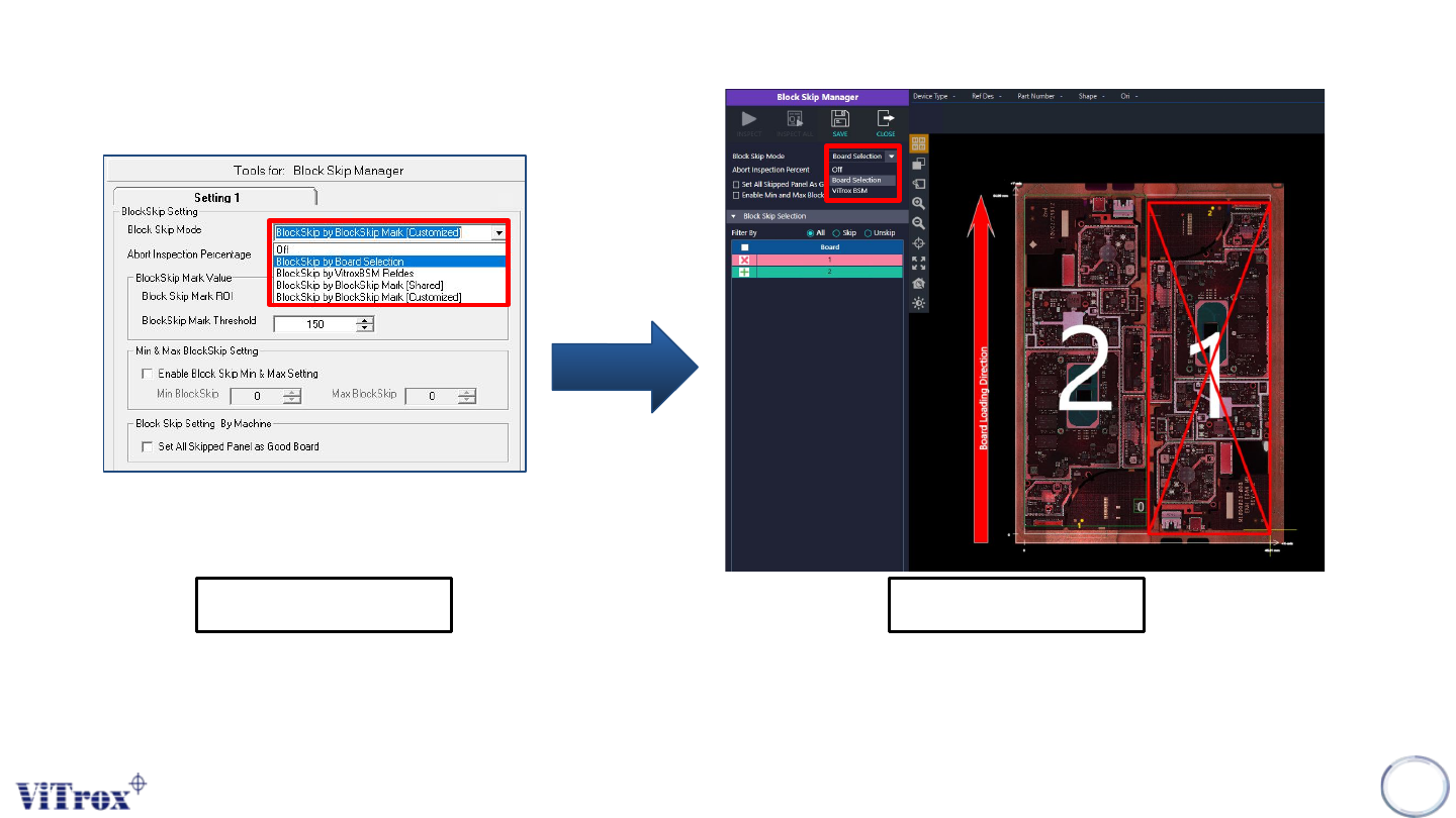 • Block Skip Manager in Smart GUI: Board Selection & Vitrox BSM.