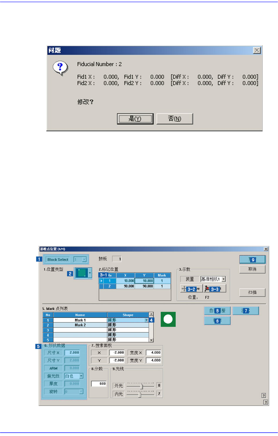 Fiducial Mark坐标与设定的 Fiducial Mark坐标之差。 要反映其差值点击“是”按
