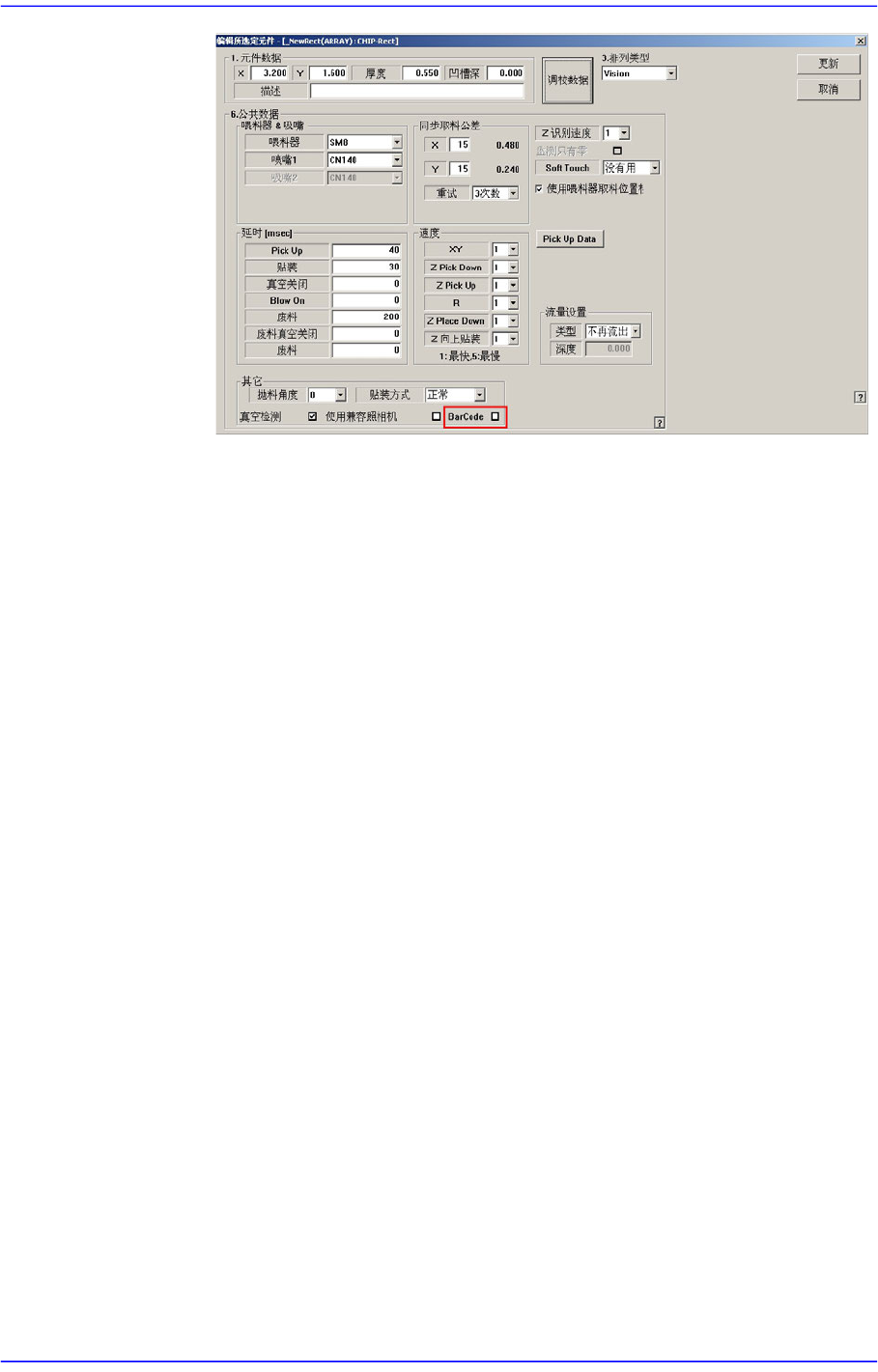 置画面圈选<BarCode>复选框显示供料器列表,该供料器供应所登记的