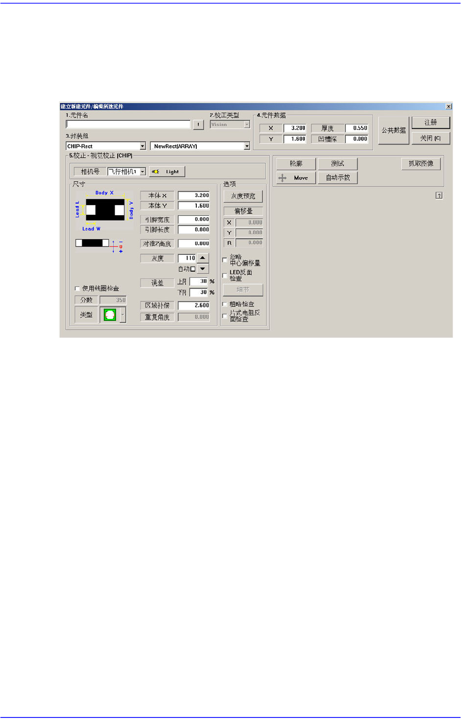 设定部品的校正数据。 在这个领域,显示在<2. 校正类型>和<3. 封装组>选择