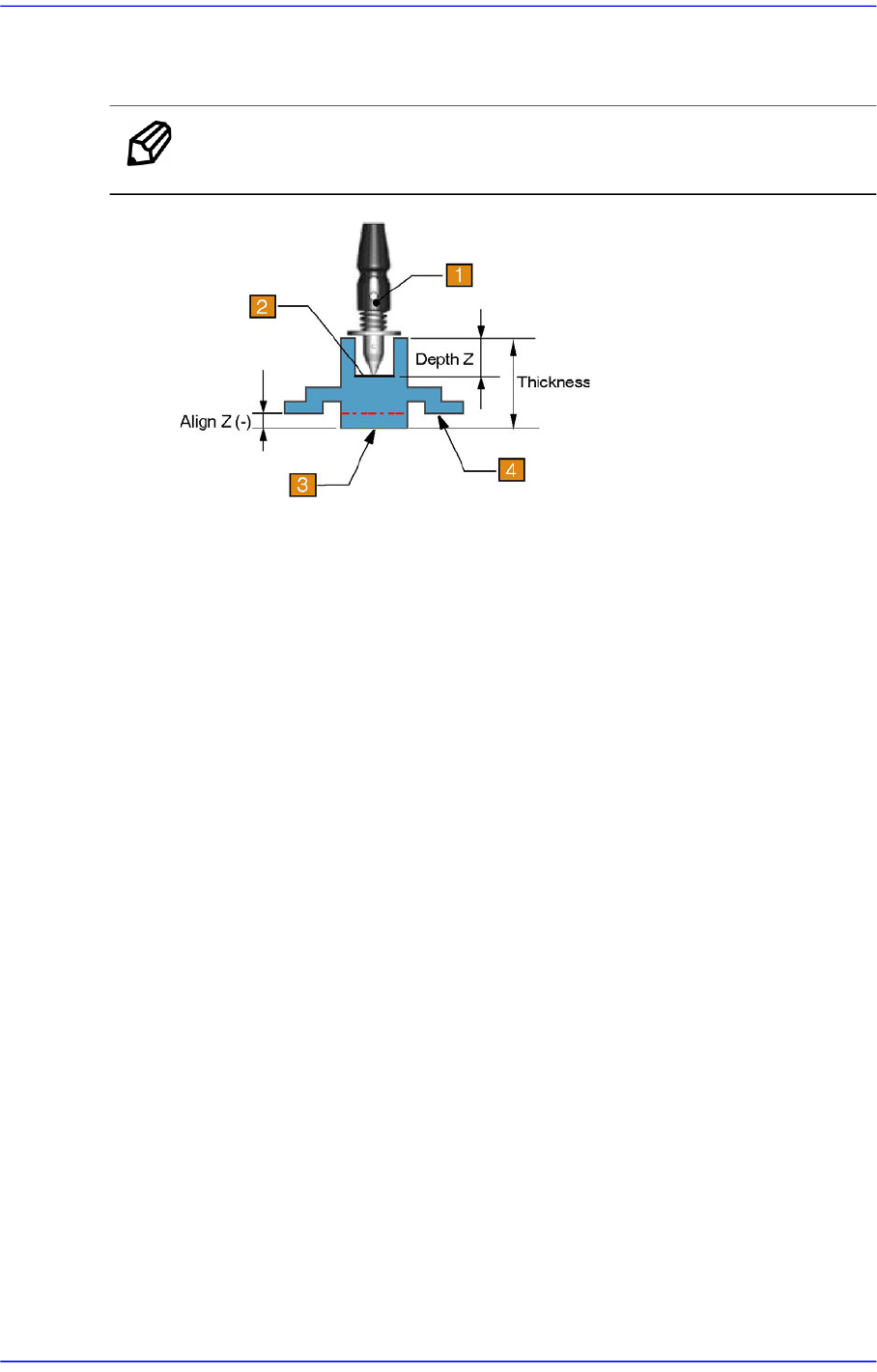 7-8 Advanced Chip Shooter DECAN S2 Admin i s trator’s Guide 设定部品的上端部的凹曹的深度。 如果 没有特别的目的, 一般设定为 “0” 。 如果是无法吸附上表面的元件, 就需要 设定该参数。 备注 深度 Z 影响 吸 附 和安装高度。 1: Nozzle 2: 部件的吸附面 3: 部件的底面 4: 部件的贴装面