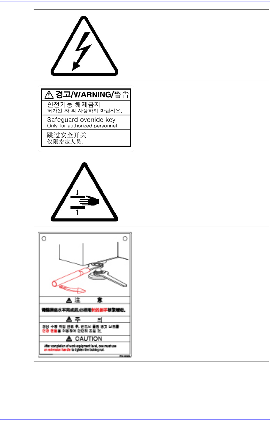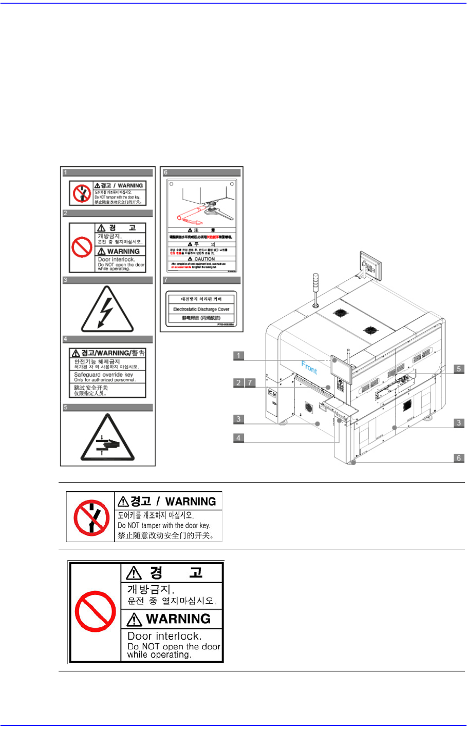 前言 iii 安全注意事項 (Safety Precaution) 以下各节的标签贴在指定的位置上。 为 了安全使用设备请遵守各标签的指示事项。 标签脱落或损伤时请参考相应图解在指定的位置上粘贴新标签。 有 关标签订购或改 善及建议事项请咨询本公司的 CS 公司或当地代理店。 设备前面 设备前面贴有以下标签 图 1.1 设备前面贴有以下标签 不要改造门钥匙。 不要擅自改造门钥匙。 否则 会危害到安全。 运行中请勿打开门 贴有此标签处…