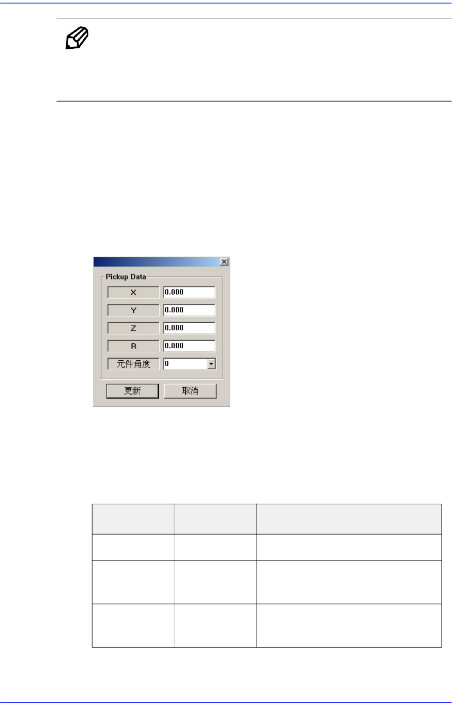 7-20 Advanced Chip Shooter DECAN S2 Admin i s trator’s Guide 备 注 如果是 8 mm 带式供料 器供应的元件, 建议适用该功能后使 用。 接合用料带基本上适用黑色。 <Pick Up Data> 按钮 可以在吸附特定元件时设定吸附点坐标的偏置。 某些 特定元件的实际吸附点 可能与设定为基本值的吸附点不同。 ( 例 : 无法吸附元件中央部 ) 此时, 需…